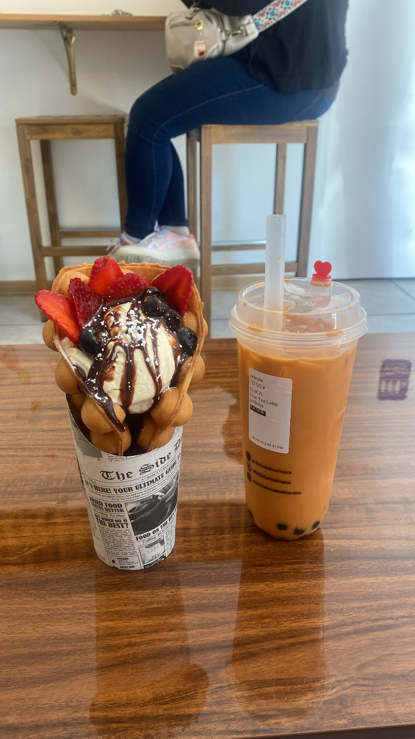 This little boba shop is a gem! I’m so glad that the Valley is expanding (slowly but surely) and opening different spots like this. The teas are good and the waffle ice cream cone is delicious. I love that there are also milk alternatives like oat milk and coconut milk. I ordered the berry waffle ice cream and it was so good. It had strawberries, blueberries and vanilla ice cream with chocolate drizzle. I also ordered a regular Thai tea with boba and substituted the milk with oat milk, it was good but I honestly recommend getting it with coconut milk instead, it tastes a lot lighter and sweeter. The staff was friendly and the cashier was patient in explaining/ recommending things to me, which I appreciated. The only thing that I do have to acknowledge is that the shop is small so it’s kind of difficult to just sit around and lounge at, especially when it starts getting busy. But I will definitely be stopping by often and trying out different flavors. If you’re in El Centro give this...