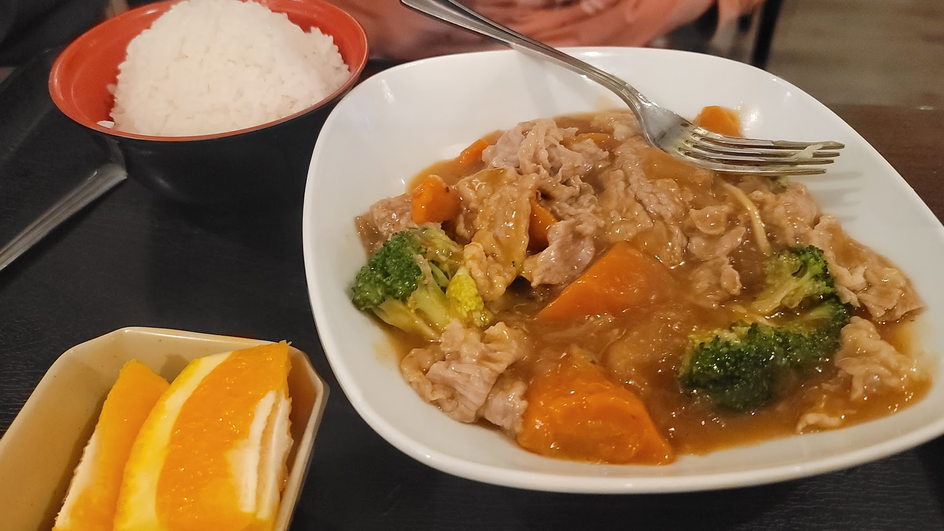 The beef curry was really fresh and delicious with tender slices of beef with a bit of fat attached. The curry was a light reddish color, almost like tomato based but with curry seadoning added. There were large chunks of veggies in it too. The curry came with a small bowl of rice to go along with it.