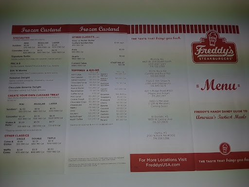 Read moreThey are excellent, and will turn any item into a lettuce burrito free of charge. Unless it's not free of charge, I wasn't really paying attention. Too distracted with hunger, which was obliterated via jalapeno steak burger. The fried cheese curds are good, my son loves em, but you should eat them first, else they get a little rubbery when they cool. Don't let this dissuade you, for they are very good, and not actually rubber. I know many details of Freddy's life from the pictures, complete with captions, that are an inescapable feature of every Freddy's. Yea, even though I am alone in the bathroom, yet Freddy is there with me. His determination and industriousness, they comfort me. 10/10 would recommend should I ever meet someone who hadn't already heard and experienced the delight...