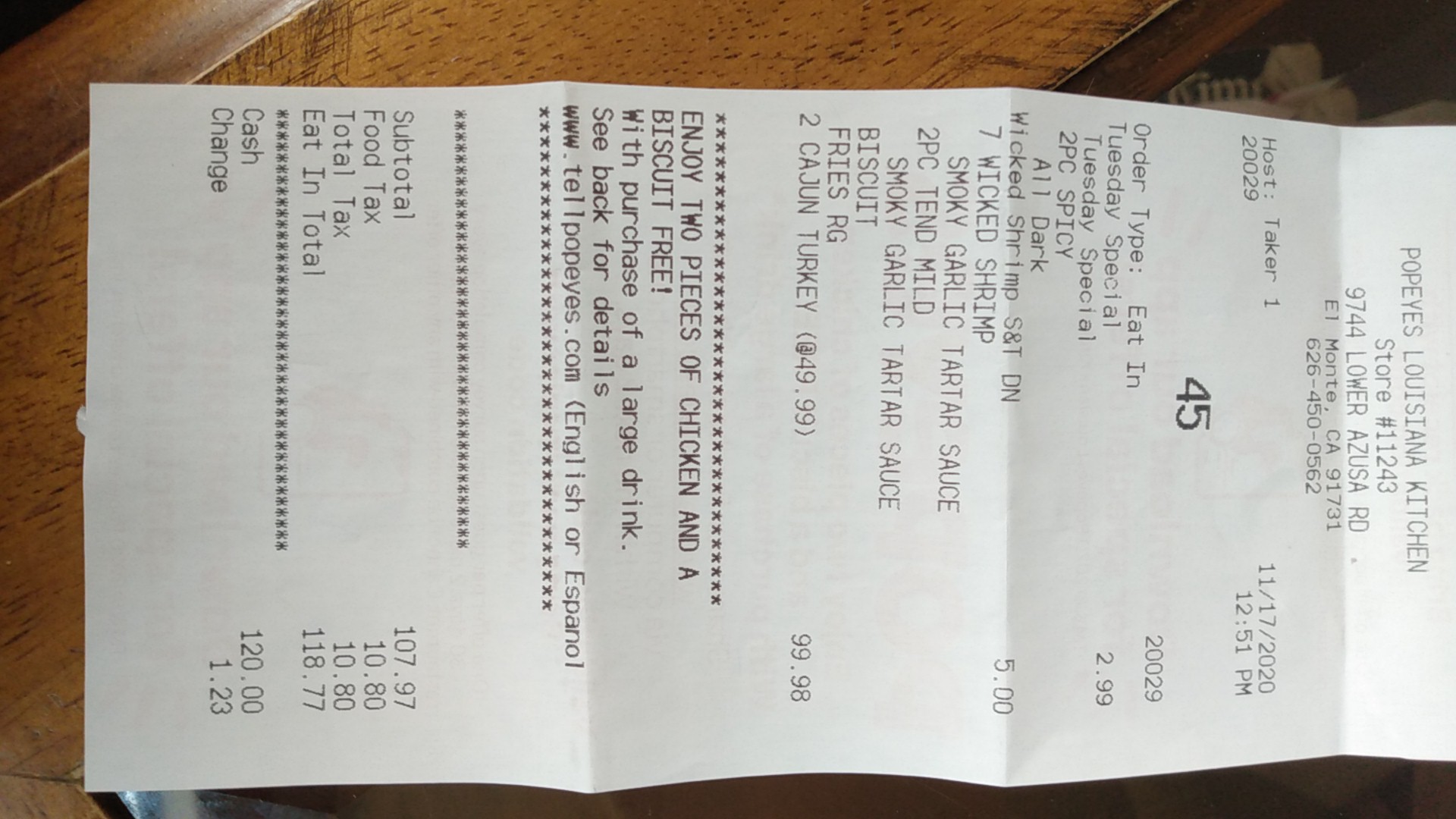 Read moreIf you value your time and money don't go here. On the off chance you go here when your their only customer your good, as soon as there are 2 or more customer be ready for a wait. I used use the drive thru, but literally last time had to wait 10 mins at speaker for employee to take the order, moved up and found there to be only one car in front of me which took 20+ mins to get their order and had to wait 10 more mins for mine. So I started ordering for pick up through the app. Don't even bother with that either they don't actually make your food until your in line at the pick up counter which defeats the whole purpose. I had to wait 15 mins the first time. The second time I had to wait 30 mins to get a pick up I ordered and intentionally showed up 15 mins late for. I don't get how management can see the logic of now prepping the pick up order until I've actually came there and said I was here for the pick up, they just back themselves up even more. Oh to mention they run out of fries and if you order through an app good luck getting a refund because the app is faulty, so theres the waster of $7 because they can't keep inventory either. There is another popeye location 10 mins away up Temple CIty Blvd which i never had the trouble, if you are going during peak hours trust me and go there. This place does not care about priority que, a lady walked in 15 mins after me and a few people went up to the desk to order, said something to the manager in spanish, I'm guessing she begged and got her...