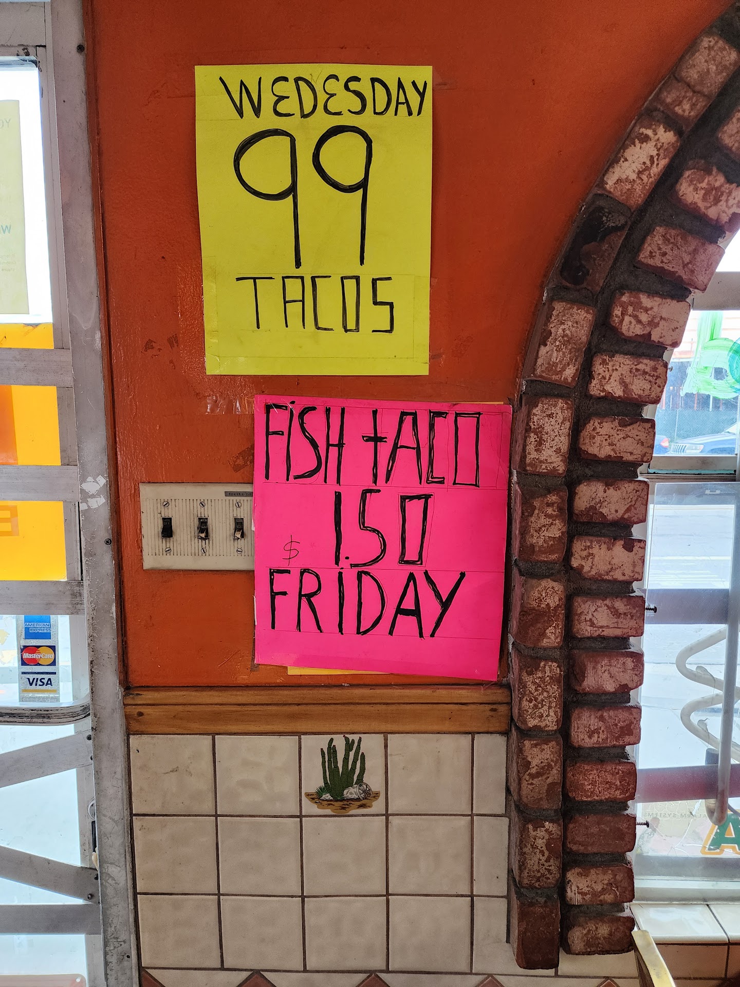 Food: Now, don't get me wrong, thr fist tacos were flavorful. They had plenty crema and the fish tacos had salt. Very tasty. But one of my tacos had barely half a fish. I ordered it woth tomatoes and onions and there was so much cream on top of a pile of tomatoes. The piece shown in pictures akrh tomatoes, you will see a small part sticking out from the blanket of to.atoes and cream, os the only piece. The size of half of your pinky. Compared to the other one on the plate it was fatty and plump. The consistency is definitely NOT there. Even with it being on special. They should make them extra juicy and sellable. I'm just speaking my mind, and mean no disrespect.