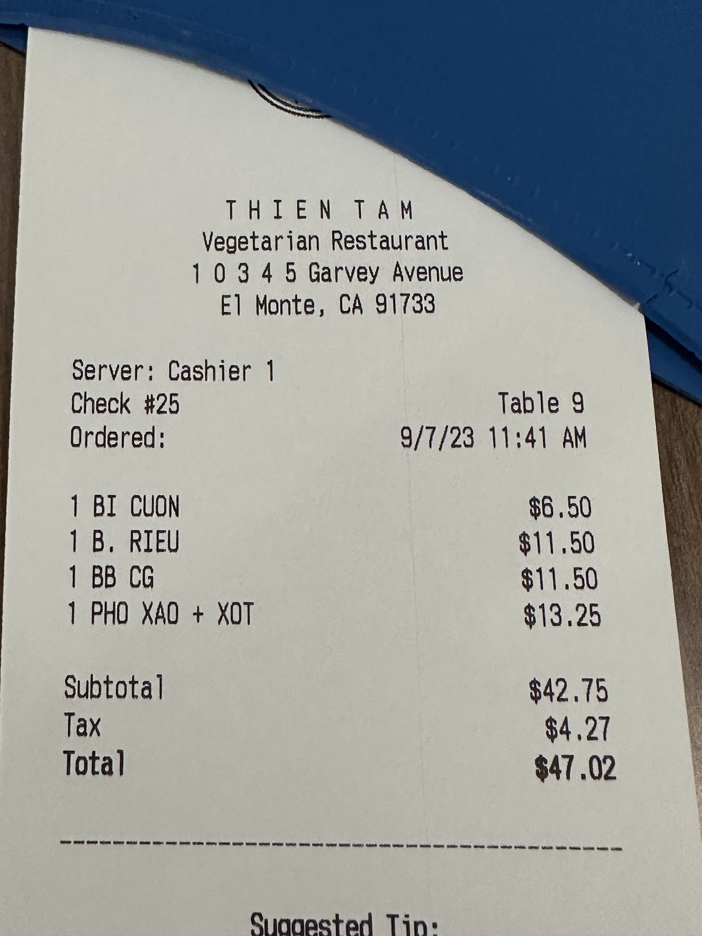 Read moreFirst this is Vietnamese vegetarian. We had the spring roll appetizer with veggie shrimp. One of the best if not the best spring roll I have had in a restaurant. When we do spring rolls at home, we set out a variety of meats, tofu, veggies and lots of fresh mints. Our whole family loves extra mint and these rolls had plenty where most places put literally only a couple of leaves. We had wide noodles with veggies and veggie meats, and the veggie soup with vermicelli pork belly and other soy meats, served pho style with mints, bean sprouts, shredded cabbage. jalapeños. etc. Both dishes were as good or better than other places serving meat. Purchased some vegan spicy flavored soybean Jerry to go. We will definitely be back! Note closed Tuesday...