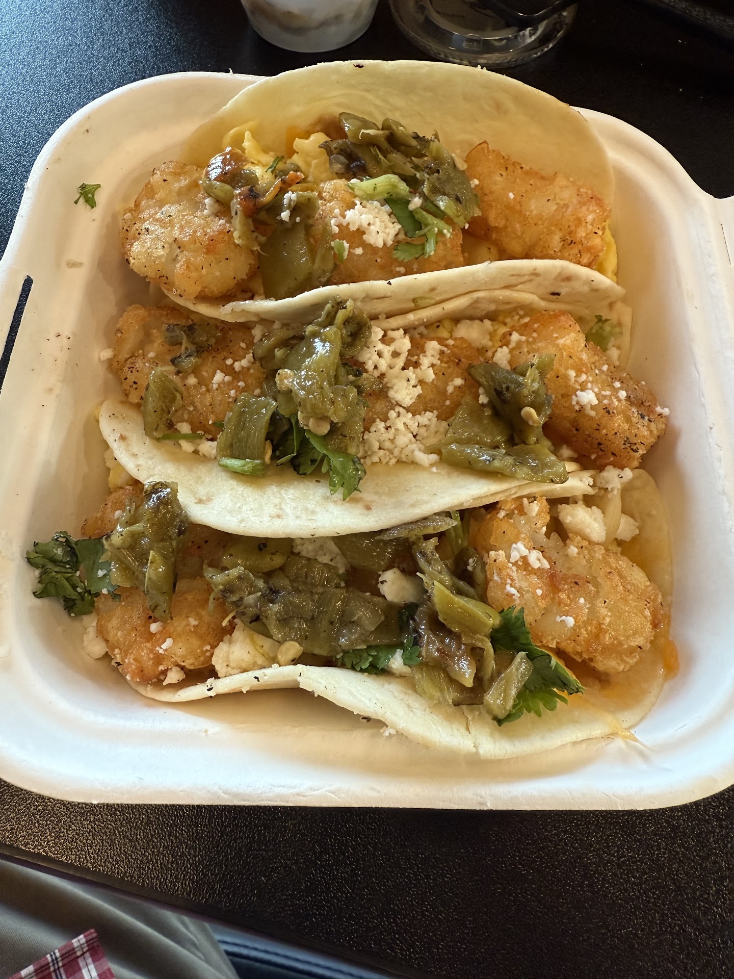 I ordered two items: a 16oz iced Spanish latte and breakfast tacos (potato). The 16oz iced beverage came with 3 shots and I must say this was the smoothest triple shot beverage in a 16oz size that Iâve ever had. Very well done. The tacos were also excellent. It comes as an order of 3 which does sound a little daunting first thing in the morning, but the size of each taco was actually appropriate so that 3 tacos werenât overbearing. The tacos were potato, egg, cheese, and I also got a green chile add on which really enhanced the gustatory experience.