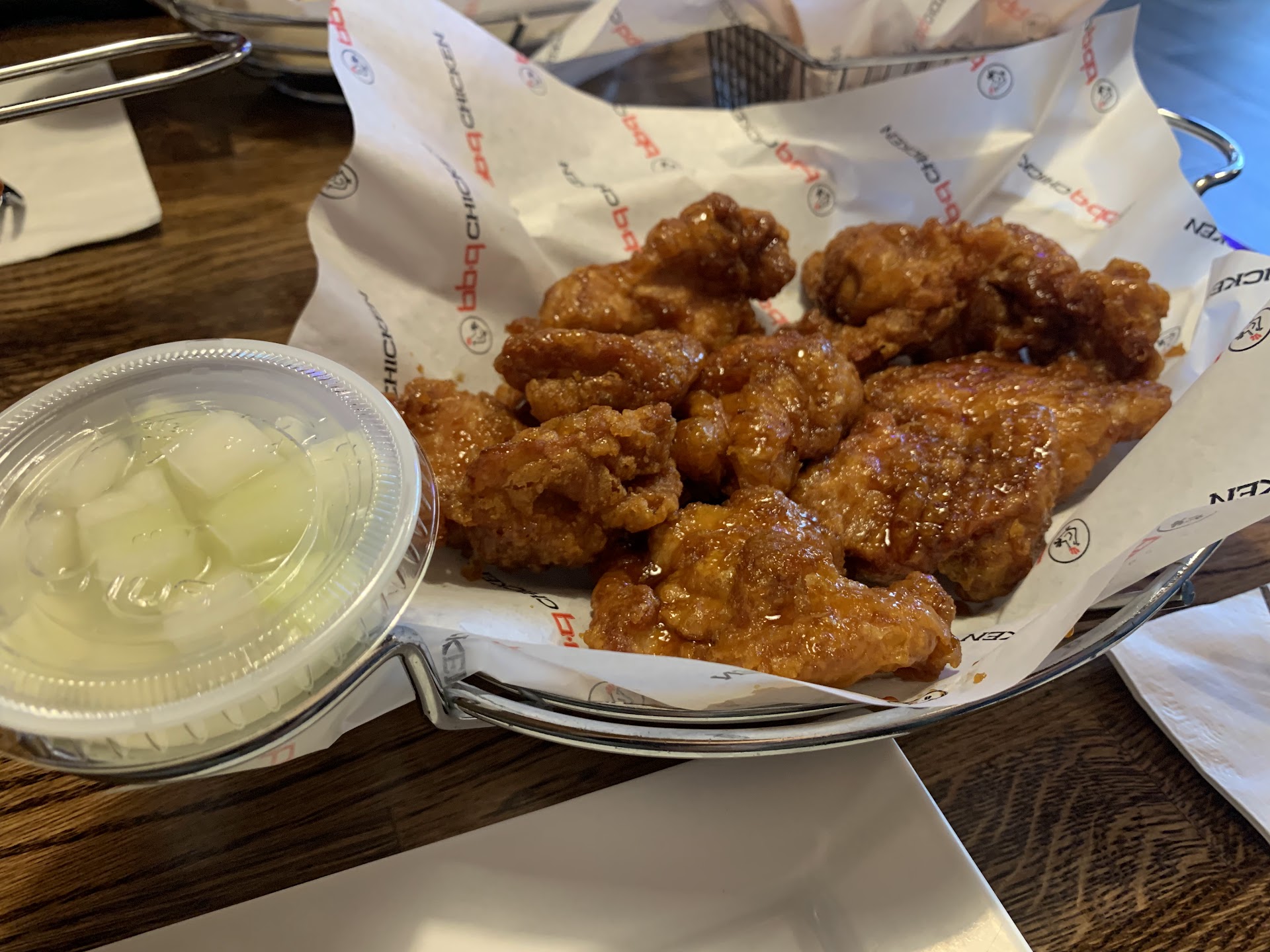 I got the Boneless Soy garlic chicken and enjoyed it. The chicken is tender and juicy with a light crunch on the outside, and the sauces are very flavorful. I also tried the Gangjeong, Secret Sauce, and Galbi boneless chicken. Of which I would rank Secret Sauce, Gangjeong, Soy Garlic, Galbi in that order, but would also enjoy either flavor on it's own. I believe all chicken items on the menu come with pickled white radish cubes, which is a standard for Korean fried chicken. From my experience, Korean fried chicken usually has intense flavors and decadent sauces / sprinklings which can become overwhelming if you eat too much. I didn't experience that here, with the medium portion Soy Garlic boneless chicken, but just an fyi. I suspect the Cheesling might be that way for some, but I didn't personally try it.