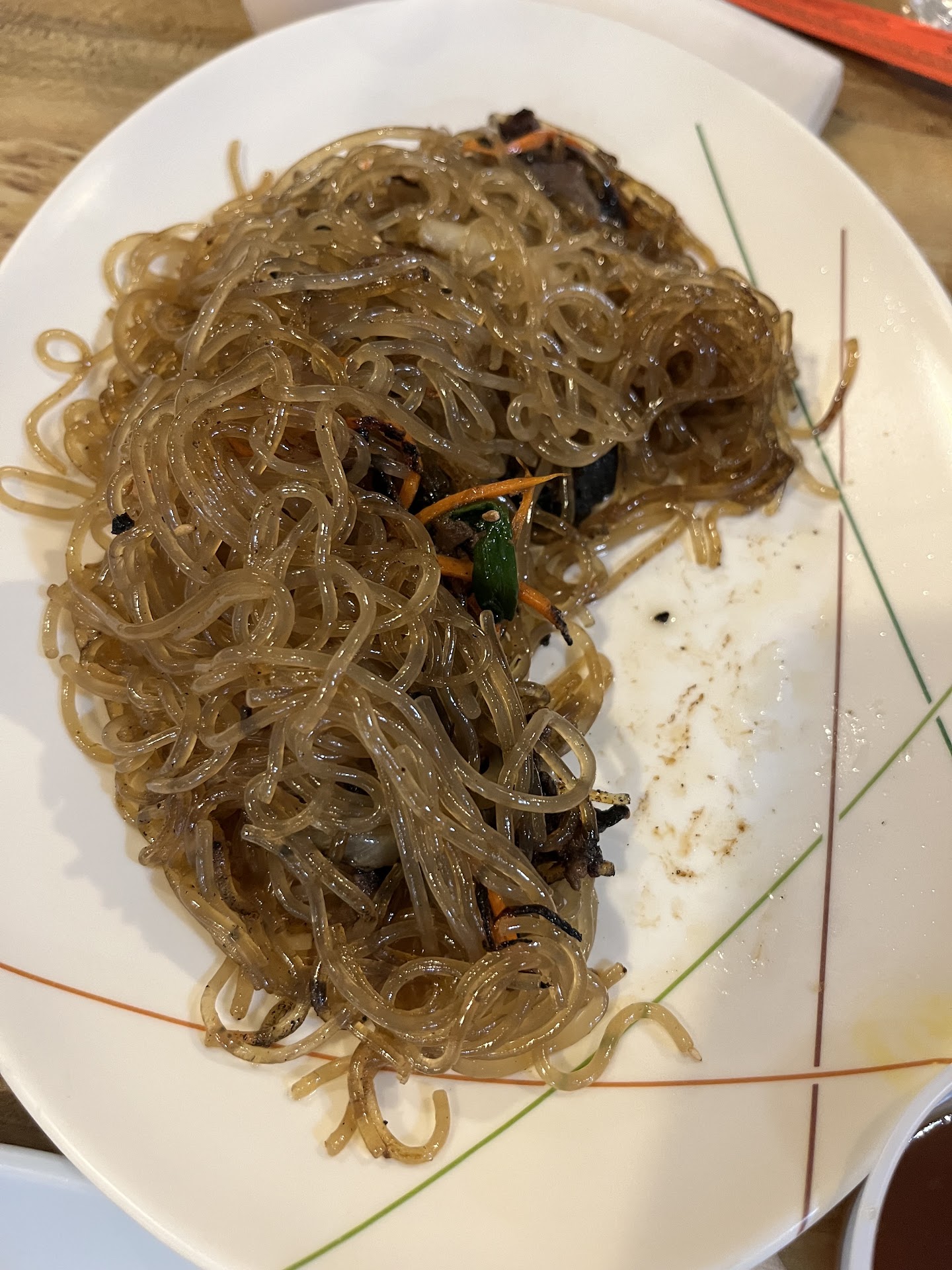 The chapchae (glass noodles) had an almost weirdly smoky flavor. Normally you get wood ear mushrooms but these were over-cooked.