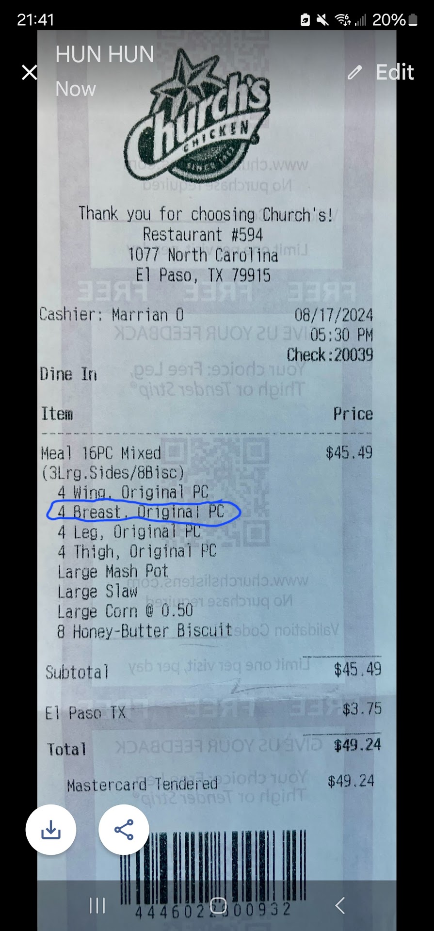 Read moreWe would always go to this Church's for the reason that the one on Copia has very bad service and food. I guess this establishment is taking the same route. Today, we purchased the $44 family meal as take out. We would trust them. Thinking they'd be honest. When we got home, I started serving the family and noticed that I was missing a chicken breast. Also, the gravy was less than half as well as the mashed potatoes. They are to be large, not small. I guess this is how they save money by cheating loyal customers. Well, future customers, I recommend you check your order when you get it before walking out with it. I sure will have them count the pieces I am getting from any Church's establishment I go to. It is sad they depend on us customers to stay afloat and for them to treat us this way. We can always go somewhere else. Management don't let your employees cheat your customers. I hope its not management's idea to serve less than advertised. Now a days there no honesty, integrity or good work ethics. These kids will move on, and where will you be?...