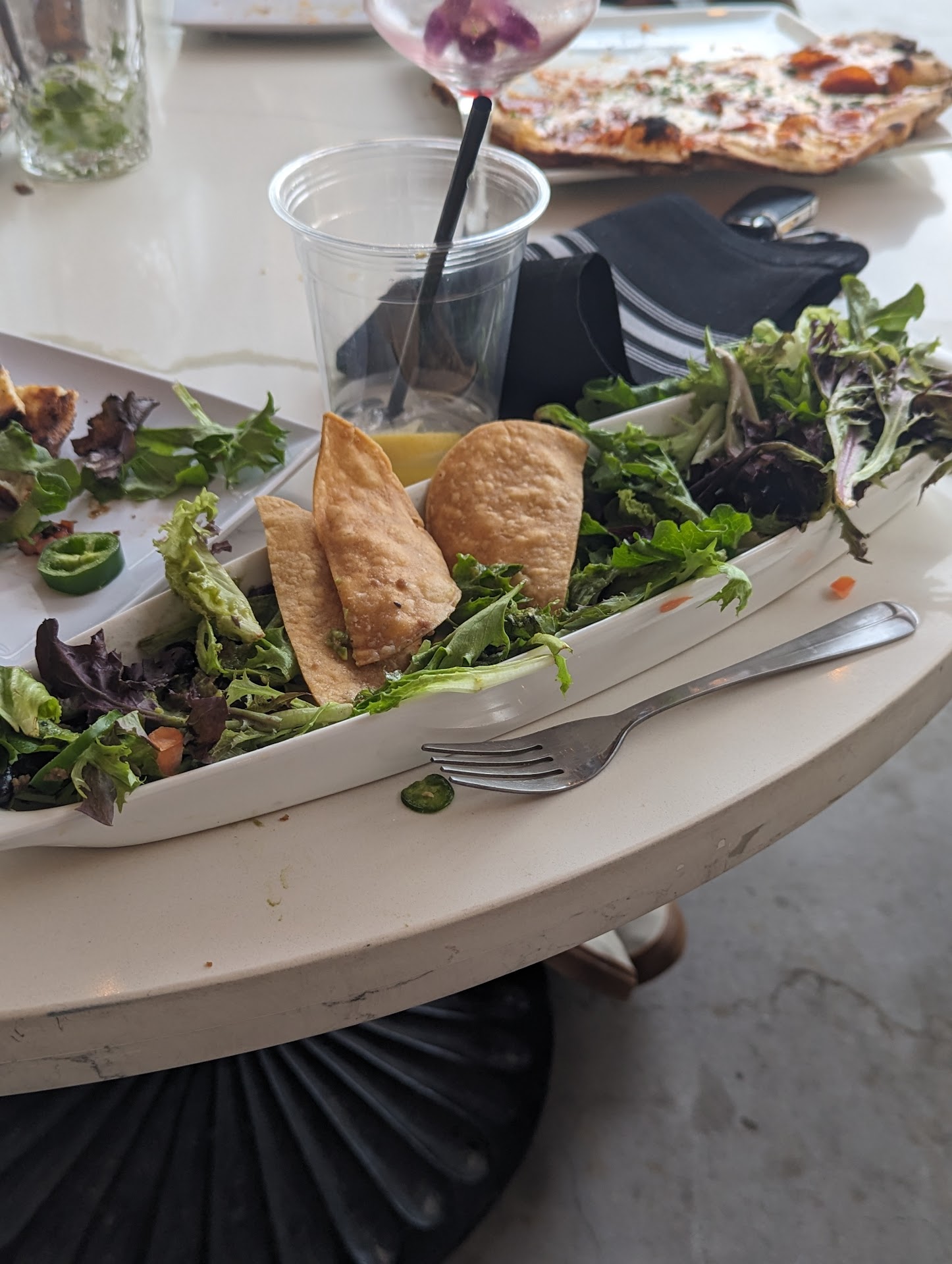 Do NOT order the "nachos" đ the service was wonderful tho! The "nachos" were 90% dry salad greens with NO cheese, NO salsa, NO crema, nada, with a small handful of meat and beans that fell immediately into the dry spinach so you couldn't really get it on your chips. Don't offer vegan nachos if you don't know how to find or make vegan cheese, there's 1000 brands. Or just buy it off the vegan restaurant on the next block đ and so you're mostly eating dry chips and if you're lucky a couple crumbles of impossible meat or a few scattered black beans. But their pizzas are okay and their servers are kind and the view is...