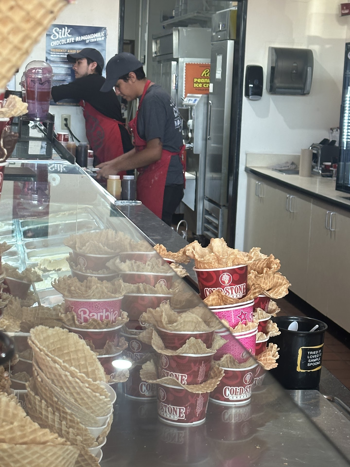 It's a sad sad day I will officially stop geting cold stone bc they are ripping you off bc they dont even fill your cup of ice cream all the way up like in there own pictures posted every where lol... there ice cream is already expensive as it is and I buy yhe love it and they would over fill it to put on the clear cover and now they fill it to the rim of the cup and all the pictures show at there store are Over filled come on man... and this wasn't just one time I went three different times twice to the one on yarbrough the first time they over fill the second time thats when they started to short you on ice cream so I went to the one on Zaragoza that was the 3rd time and the same thing...and remeber when they use to over fill and give you anything extra in a small cup well yeah they don't do that any more... I spend 30 bucks for 3 people that's alot for yall not to fill the cups up like in yiur pictures like yall USE TO DO. Total rip off I won't be goin back again...who ever is training yall needs to...