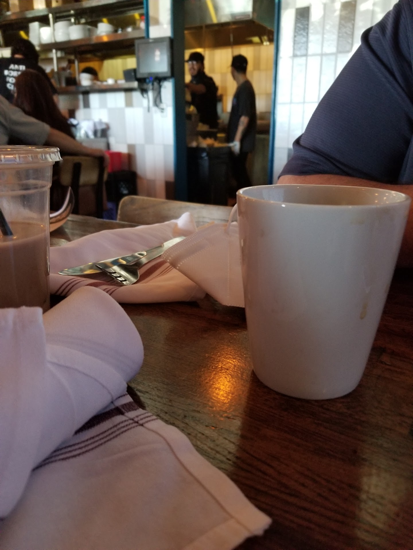 Read moreMy first visit to this location on Mother's Day. Not horrifying enough to get a 1 star but not memorable for a 3 star either. We arrived close to 930 am, was decent not packed considering it was mom's day. Most wore masks but then my husband noticed no one in kitchen wearing masks (see photo) not cool. We were served our beverages in a timely manner. My coffee cream came with specs my husband kindly ask if it was supposed to come with particles đ, server reply oh that coffee grounds, he literally spilled out that one and in same cup poured new creamer, really dude? Anyways 2 of our utincil sets had dirty crusty food on them and coffee cup and a plate was also dirty (noticed this common theme in other reviews). Food took FOREVER to arrive mine you they weren't extremely busy; at list 45 min to get food (another common theme). Food was not great, ordered whole hog scramble it was drenched in oil and tasted only like grease. My kid and I had pancakes, hers served in a bowl and mine in a puny plate (see photo) ridiculous đ and were tasteless and doughy dense, the honey butter really gross. Chilaquiles my hubs ordered were about the most tasty of the dishes I'll give them that. My kids sausage side burt, and tasted charred as well as my hubs hashbrowns (we didn't bother to eat either or) which aligned with the fire in kitchen smell and flames we saw from where were seated. The open kitchen is horribly placed for sever traffic and I dont find it pleasing to see the chaos of the kitchen staff and trash can and unorganized plating station. Did I mention NONE of the kitchen staff has masks? Restaurant ambience was nice, small. Will I be back?? Maybe just maybe next mothers day. Would...