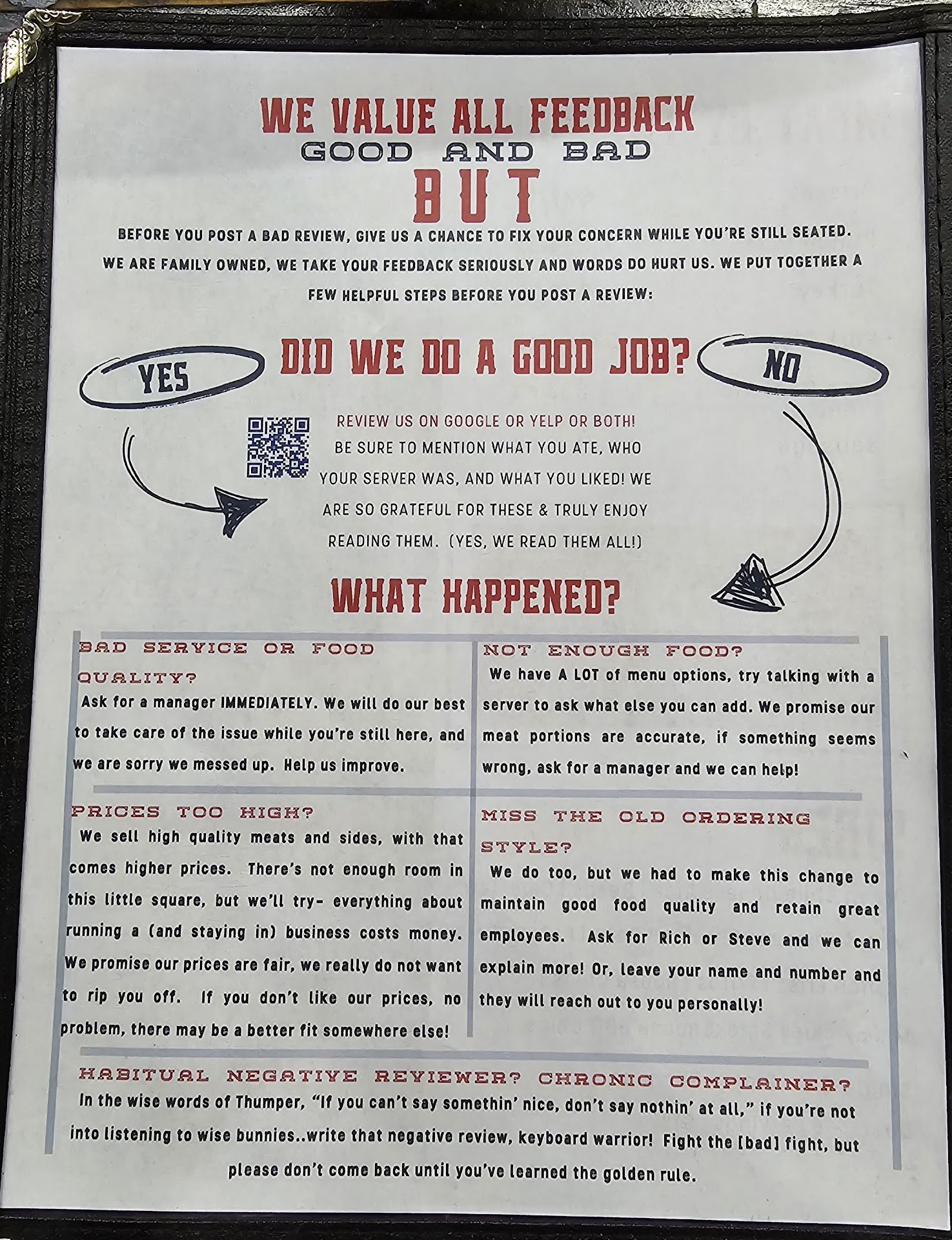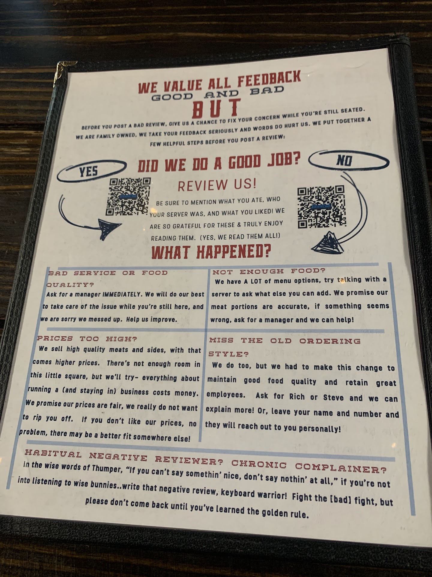Read moreWe went to Desert Oak BBQ, upon a high recommendation from a regular customer. Yesterday was the perfect day for it, it wasn't very busy at Desert Oak BBQ. Sorry this may be a bit long. Sofia was our server, very courteous and professional. Being our first time was difficult to order what great food this restaurant offered. My wife ordered the turkey and sausage with potato salad and beans, I wasn't sure what to order. So I order the Dino rib meal. Upon getting our food, my wife was happy with her Turkey and sausage. She thought the beans would be like baked or BBQ beans, it wasn't, maybe we should've asked. The Dino meat was not quite what was expected, it was very big, came with a bone, must have weighed at least 1.5 to 2 lbsđČ. At first looked very delicious đ, but once I started to eat it, noticed it to be oversaturated with fat, which could be expected. But it had a lot of liquid fat as well. So I brought this up to our server Sofia and said she would.let her manager know. The manager came by, mentioned to her of the Dino meat. She apologized for the meat being greasy, and mentioned the Dino had fat on it. It was mentioned to her, it was way too much, even with a beef rib. She offered 1/4 brisket and mentioned that was not enough for what the meat weighed. She offered 1/2 a pound, I declined and said to not worry about it. I'll leave it as it is, was not asking for the meat item to be removed from the bill. It could have been handled better. She did offer 20% discount. I wasn't quite content with the meat, though the sides were great which were Coleslaw Green Chile rice. That was great. With this, I'm just one customer and sure that many come here to enjoy good BBQ. Sadly, wil not be returning. "Sofia if you read this, thank you for.your Profesional courtesy and service." Finally, to the upper management I saw the scan for both good and bad reviews, didn't have the QC code. Though, I did follow chain of.command, the end result did not end well. Been to.many BBQ, this did.notwell. well. Hope it gets better. Thank you...