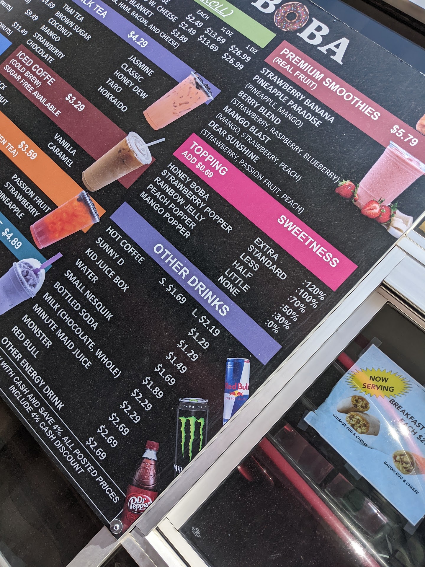 Read moreGot this through postmates and it wasn't what I expected. There's a location on mccombs that's closer to me and it's great but didn't realise this was another location till It showed my driver was 15 minutes away. I ordered Hokkaido milk tea and it was nothing like the way I had it from the other location. No caramel, and even worse NO BOBA. On the app it doesn't even give me the option to add any boba or toppings so I assumed they already would have boba included? Also ordered a chocolate donut filled with Bavarian and the donut was not chocolate but glaze. It was still pretty good. Tried a little bit of the kolache and asked for sausage and cheese, there wasn't any cheese. I guess it was a bad day or it's better to visit the place in person, but I'll stick with the mccombs...