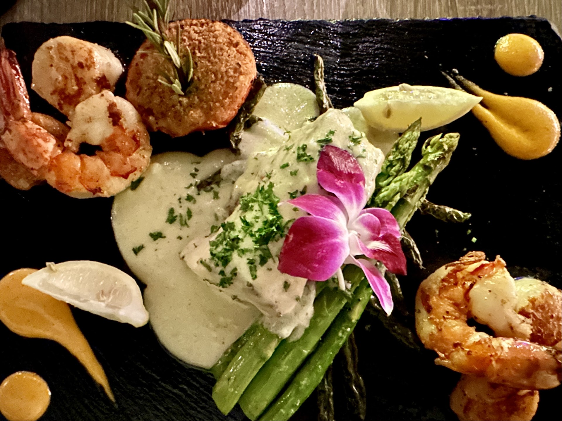 Now to the food. There was no French bread, or any finger food to help with the wait. We ordered the Terre & Mar (Steak, Lobster, Prawns, and Scallops) plus dessert. The flavor profile was good, but after waiting nearly an hour the food came out generally lukewarm to cold. Talk about disappointing.