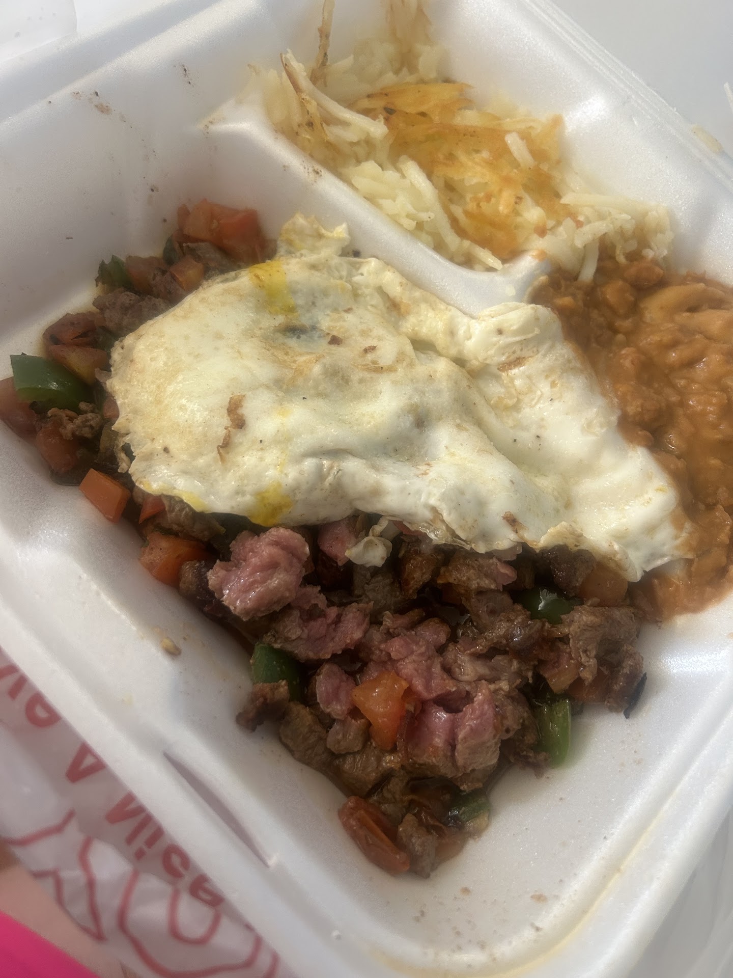 Fast forward to today — I ordered the steak ranchero plate. This time, I received steak that was partially raw. I had to drive back to get it fixed, and while they did remake it, the new plate came out with burnt jalapeño and tomato pieces and no salt or seasoning in the steak or eggs.