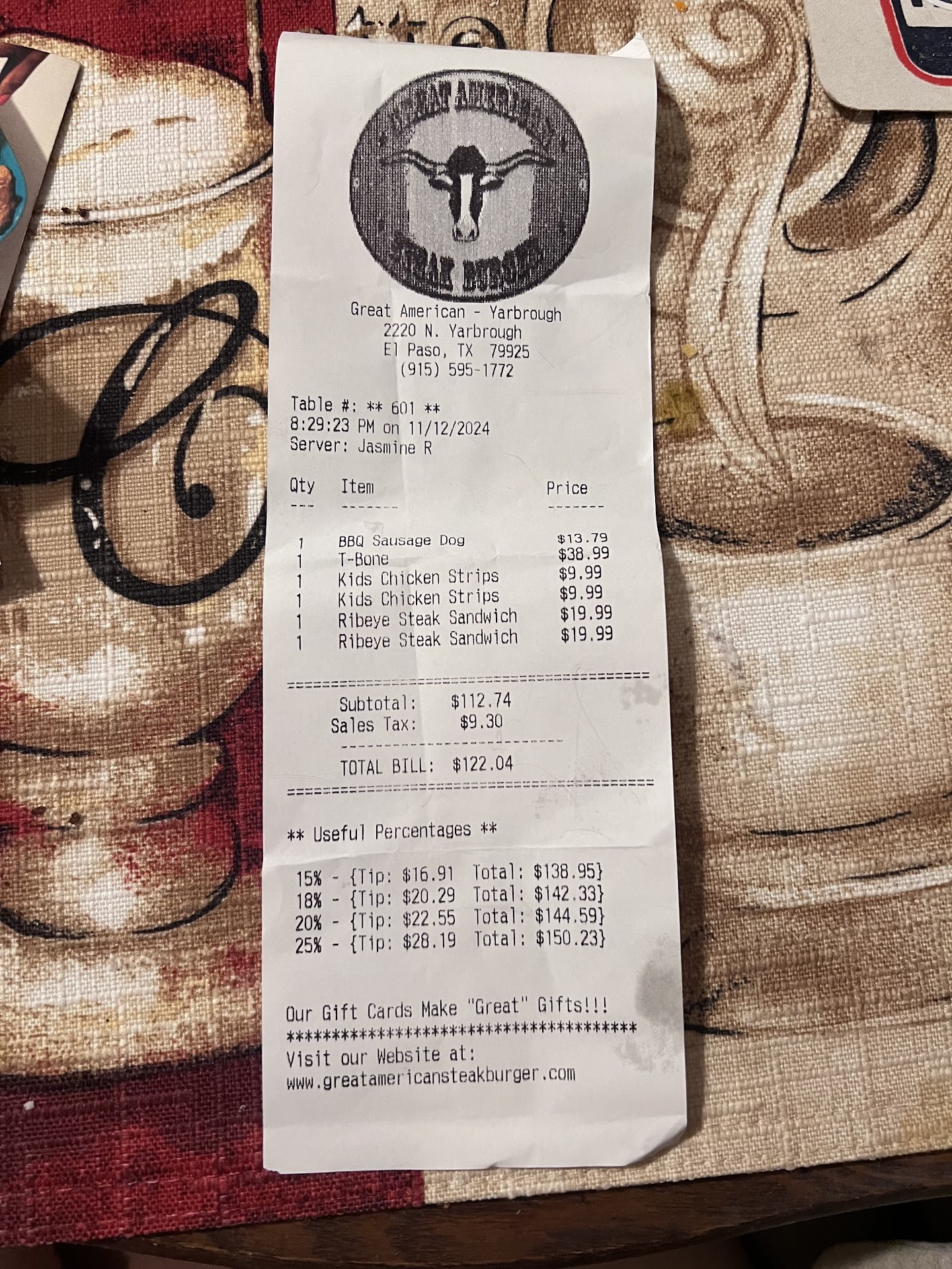 Ā Ā Ā Read moreWent to Great American on Yarborough and had the worst time spending my fatherās birthday. Yes, we showed up at 7:30pm when they close at 8, however, we were specifically told when we asked if itās to late that āno itās fine.ā From the start our server was rude , bothered that she was seated and made several comments out loud to the back that āI still has two tablesā also later said aloud ātheir leaving,ā when were just finishing up. We were never greeted, she took our order in a rush, never checked on us, my ribeye steak sandwich was scrap fat(I ate less than half of my sandwich that was the only decent part, I ate only fries)I ordered it medium and it was rare, I had to ask for refills, because she was too busy cleaning up in a hurry and turning off the tv. We literally all felt uncomfortable and rushed and didnāt feel welcomed one bit. We left the restaurant at 8:30pm showing up at 7:30pm , which means 1 hour minus the 20 minutes for our food to come out left us all eating in 40 minutes RUSHED! We werenāt thanked just asked āall together or separateā? And left the receipt. When paying in the front she was there and talking out loud infront of us asking the bus boy are you tired? We left and no thank you other than by the girl who charged us. Iām not one to complain, but Iāve been here so many times and this is by far the worst choice to spend a birthday. Not worth the price and saddens me that a birthday was not enjoyable because of our service...