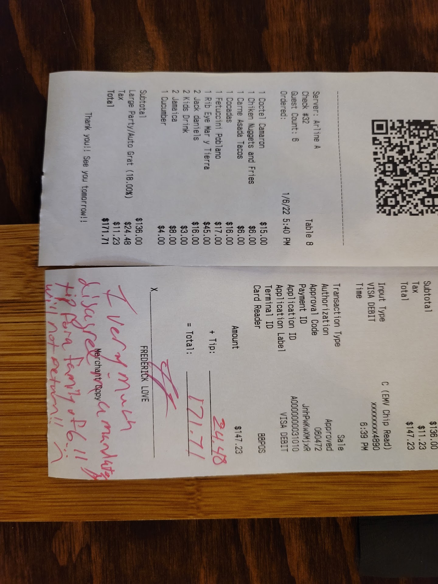 Ā Ā Ā Read moreThis is my first time at this location. The restaurant is very ample with plenty of seating. It is well decorated and just make you remember about the sea. The restaurant is very clean, they have a huge selection of tequilas. The personnel is very friendly and knowledgeable about the items on the menu. The food it is really good, the flavors and freshness on seafood is excellent. The menu it's very extensive and it's hard to choose due to everything looks really good. My two kids love theiir food. I ordered a shrimp taco, octupus taco and a fish taco. I really like the flavor and originality of each independent taco. The first 2 are not that big in comparison with the fish taco. If you are really hungry go for the fish taco. My son tried the shrimp and octupus cocktail and he just devour the food. He was amazed with the flavor. My wife tried the fish soup and also really like it. The portion sizes are good. My little one had fish and fries and he also loved his food. Totally recommend the restaurant, just keep in mind that most of the menu is seafood so prices are higher but is close to other restaurants offering the same type of food . It is also important to mention that the service is very good and the servers are constantly checking if you need a refill or anything else. Another thing that I liked is that the main dishes didn't take too long from preparation...