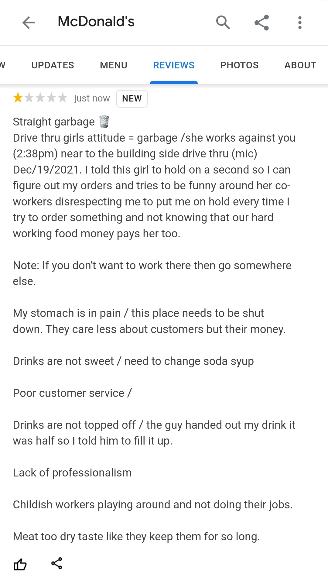 Read moreIâm not a complainer but Iâm complaining. The service was horrible tonight. It was busy so I expected to to take a while but I waited 20 minutes for 2 double cheeseburgers and a small fry. Get all the way back downtown to my room and and they are rock hard. I mean as in old. The buns would literally crumble in your hands. Then I open them up and the meat was dark brown...not over cooked but had been sitting there for a long while and they were plain. Not what I ordered. Call the store and was told if I made the 15 minute drive back and park in the pick up stall theyâd replace my order. Get there called and waited another 15 minutes. Manager brings out the order and walks away. I check the order and they were fresh but had no fixings (ketchup, mustard, onion, or pickles). I should have been satisfied but at that point itâs been a 40-minute wait and I drove back for it. I wanted it corrected so I drove back through the drive thru, got to the speaker and told them my order was still wrong. I get to the window and they pull me up and still waited another 25 minutes!!! They should be ashamed!! It was just 2 double cheese burgers and a small fry. No modifications. It shouldnât have taken 3 tries and an hour of my time. Not to mention the eye rolling from your managers....