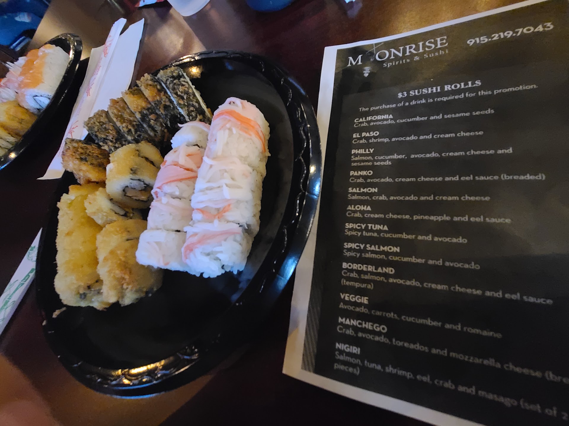 Dropped to 4 stars because the sushi rice was way overcooked and was not seasoned well. Cream cheese was way too much compared to the rest of the ingredients inside the rolls. We were recommended for the specials. They were $3 each roll. Which is great but I would not go again. We got the El Paso, Panko, Salmon, Aloha, Borederland and Manchego. The eel sauce and spicy mayo is given to you on the side. Ginger, soy sauce and Wasabi are all given by request. Thank goodness because the flavor would be missing. The staff was fantastic!! They suggested meals, appetizers and drinks. He did explain how certain dishes were made. That is nice knowing how much knowledge he had with the menu. They were very busy, but very nice and constantly making sure we were okay. We did come during the rush and waited 25 minutes. No big deal. Considering all the new covid rules its fine. The reason I gave 3 stars is because of how they cleaned. They wiped down the tables and chairs with a disinfectant spray and used the same rag they used to wipe the menus. They never changed the rag or cleaned it after cleaning 3 tables. With all the covid stuff happening it would be wise to clean/rinse the rag and/or just use paper towels for...