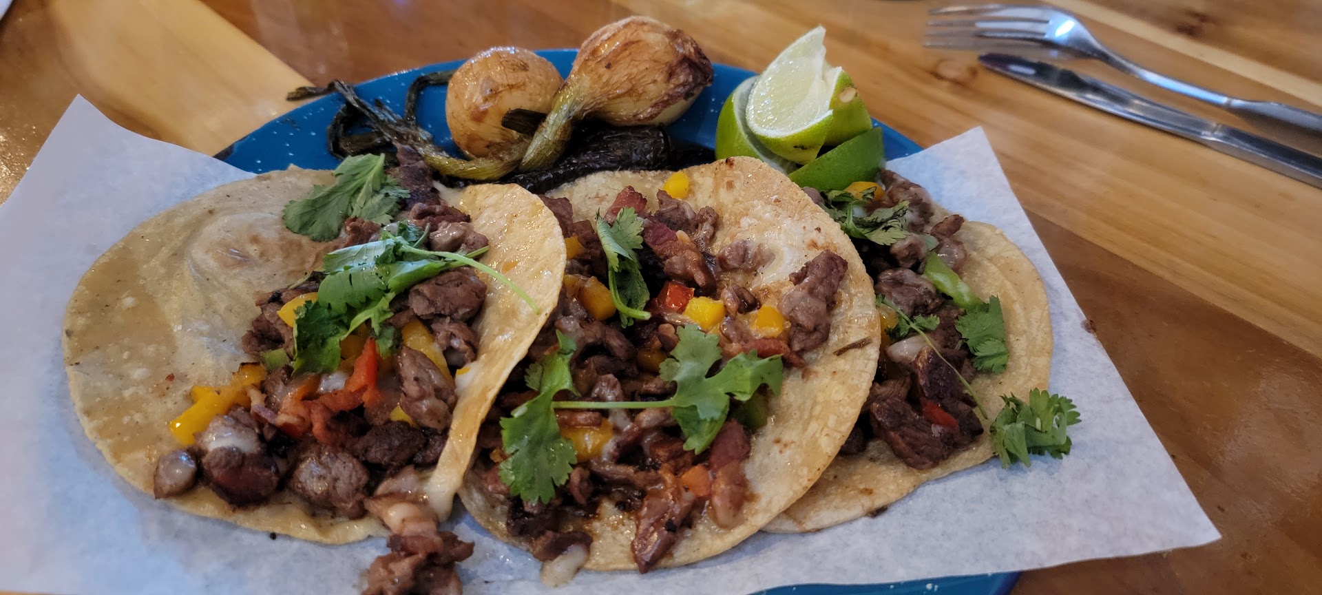 My food was good... Tacos Alm-something. My only real complaint—other than the fact that I didn't get any fries when the online menu mentions "more fries" being an option (which implies there's a normal fries option included)—is that it was very, very dry. Sour cream would have been perfect, but I had to settle for some of the spicy avocado stuff that our chips came with.
