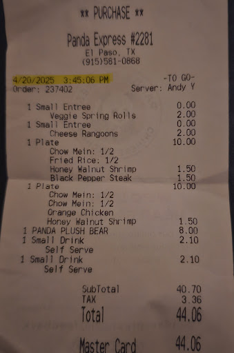 Read moreandres and isreal both males were very racist to me when i came in Christmas eve on the 24 ,i came in and i was the only one in the line, i was told they were closing but mind you i came in at 7:00 and closing time was 8 thays btw. i asked for a thereaki chicken but they didn't have it so i asked for the honey walnut and this is where it got interesting they told me people ordered before i did in the drive through but no one was there just one car but suspiciously they were packing in alot of food on the 2go plate for themself i guess. The wierd part was that they were packing the honey walnut shrimp into different plate while i was standing there without being talked to or looked at and i was watching as the shrimp was almost little to none with a few crums and then that was when they decided to give the dog the last crums of the shrimp this was really annoying and unbelievable and mind you i was the only person in line RACIAL PROFILING ISNT ACCEPTABLE AND I HAVE BEEN COMING HERE FOR A WHILE AND BECAUSE MAYBE AM BLACK I GET LOOKED DOWN OM BY THIS TWO GUY (ISREAL AND ANDRES WITH GLASSES ) THIS IS UNACCEPTABLE AND I NEED AN ANSWER. THINGS LIKE THIS STILL HAPPEN IN OUR...
