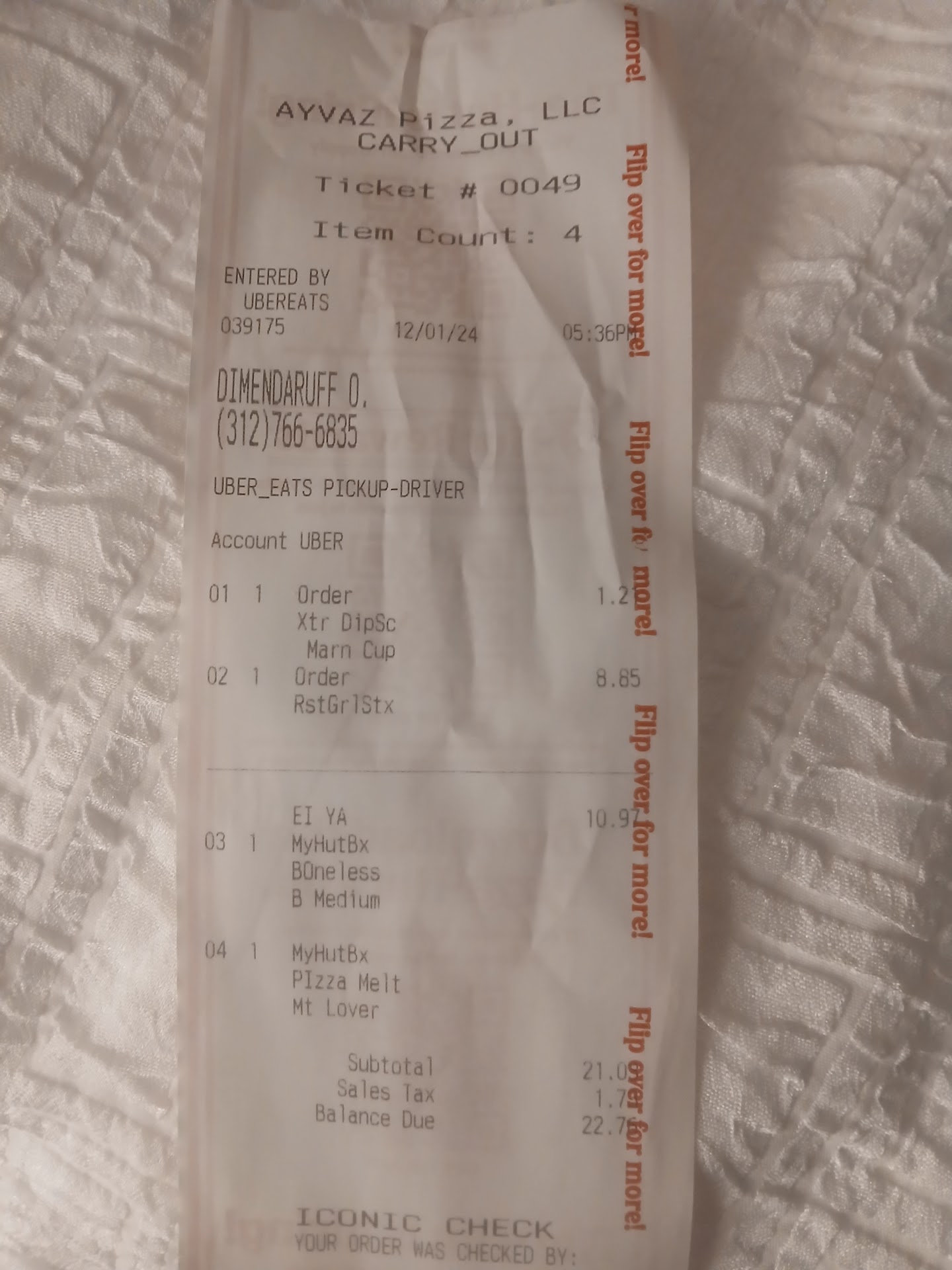 On Thursday, March 13, 2025, at 5:34 PM, I attempted to place an order with Pizza Hut, looking forward to enjoying some pizza brownies and a buffalo chicken melt. Unfortunately, what should have been a simple order turned into an incredibly disturbing experience.