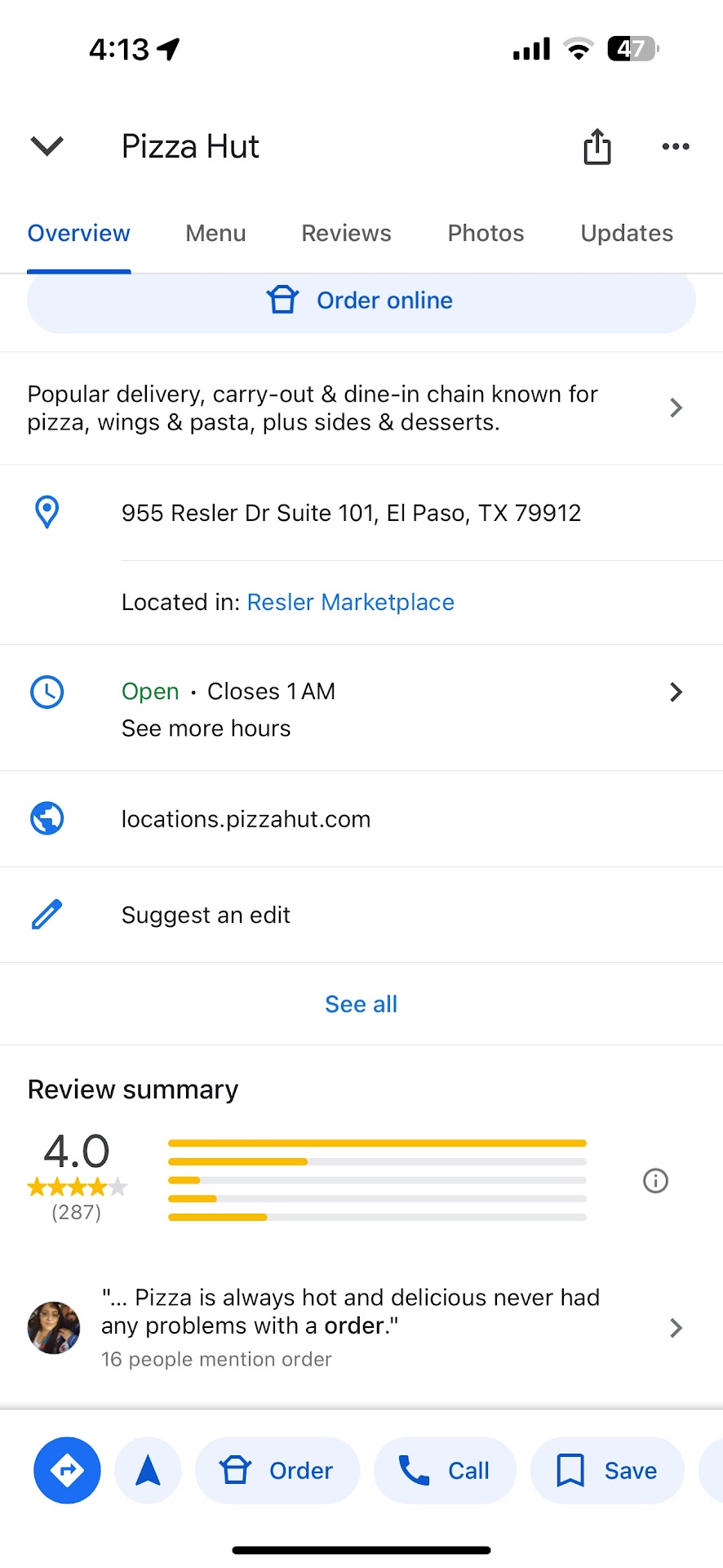 Read more8/7/2016 Placed an order for a family feast deal special at 5:41 pm provided my phone, credit card info, and address for delivery yet at 7:15 still no pizza. We called for status of delivery since the delivery time estimate was supposed to be 6:41pm. and we were told that a manager would call us back??? Really? No call 15 min later my husband drove down to see if we could get our order and they did not have our order in their system. We called Pizza huts number on 955 N.Resler here look at my phone I gave someone my card info. So beware if you place an order on this location. Apparently calls get sent to a calling center and then the call center gets blamed so if you want to take a risk. As for me I am ordering Dominos right now and watching the "Dominos tracker" online...