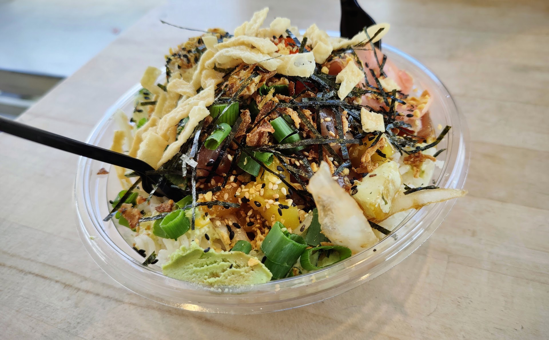 Poke Your Way Regular: We got a regular bowl with 2 scoops of ahi tuna since there were no other proteins we wanted. You can choose your base, mix-ins, toppings, and sauces. For the base, since they didn't have kale noodles or salad, we got half white rice and half brown rice. The rice was really good, especially the brown rice since it wasn't dry at all. For the mix-ins, we got cucumbers, sweet onions, edamame, pineapple, mango, & mandarin orange. The fruits gave the bowl a delicious sweetness that went well with the ahi tuna. For the sauces, we got umami shoyu, sweet shoyu, and a little bit of the spicy serrano aioli. The flavors are what made the bowl really good because the ahi tuna wasn't that fresh. For the toppings, we got surimi (crab) salad, masago, green onions, pickled ginger, wasabi, & furikake. For the crunch, we got onion crisps, garlic crisps, & shredded nori. Everything went well together. If you're not that hungry or eat a little for lunch, you can split this bowl with...