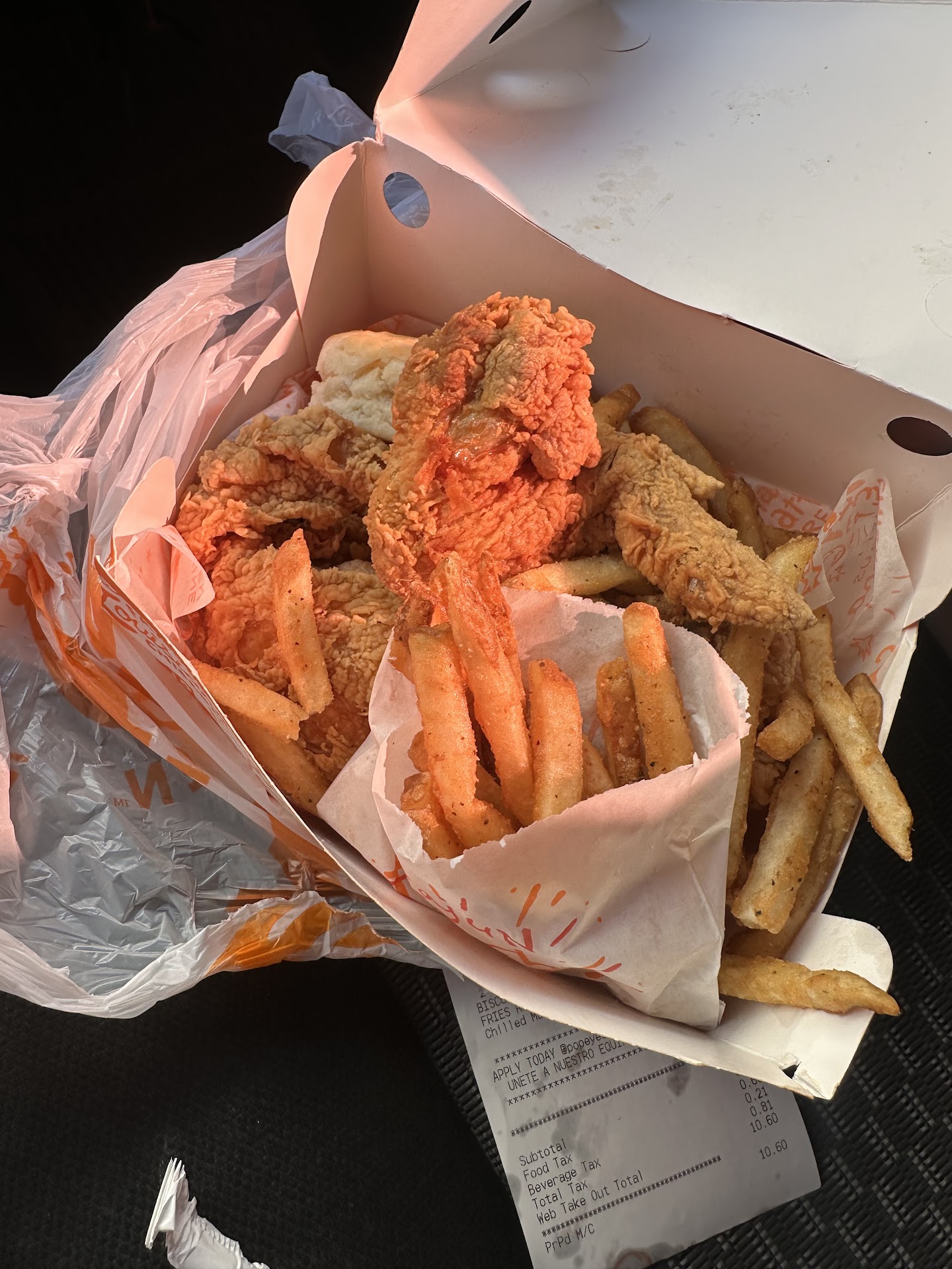 Read moreSo i went in this evening for a 5 piece spicy, because lets face it, their spicy strips are unmatched. So the dude at the counter works with me since i didn't want a drink and saved me a dollar and i still got my biscuit and side. I was already pretty stoked .then he asks if I would mind waiting for fresh strips...um, no problemo broski, i prefer freshies. It took maybe 10 minutes, a reasonable amount of time to fry up some strips. When i recieve my order, the lady that gave it to me informed me that for the wait, she gave me an extra strip and apologized( again...i felt the wait was totally reasonable) I thanked her and went on about my evening. To the guy and lady working tonight, thank you for an excellent customer service experience. It was pleasantly refreshing!! And as always, the food...