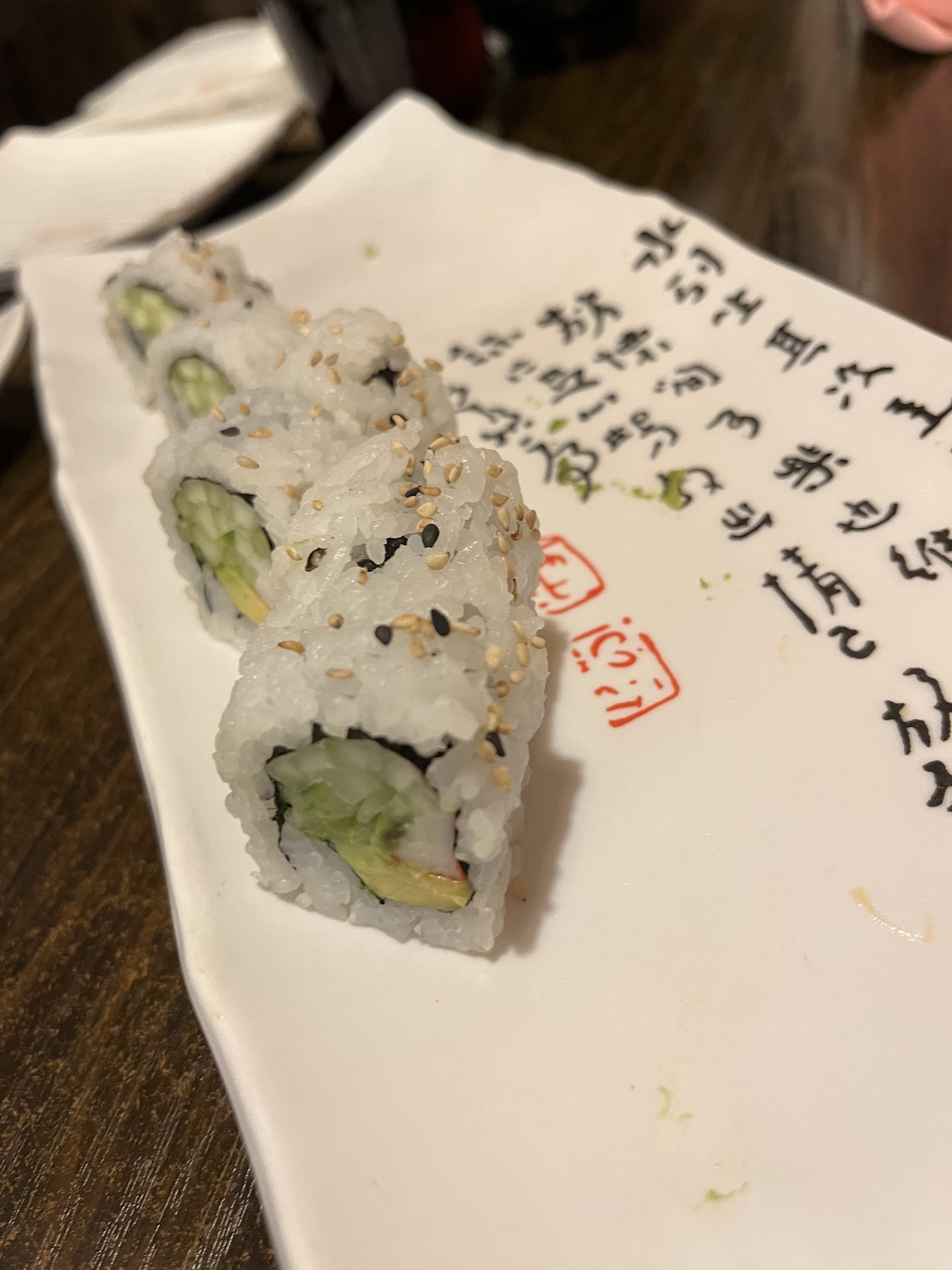 Their California rolls are now 80% cucumber, with just a small amount of Avacado and half or a third of a crab leg , pictured below.