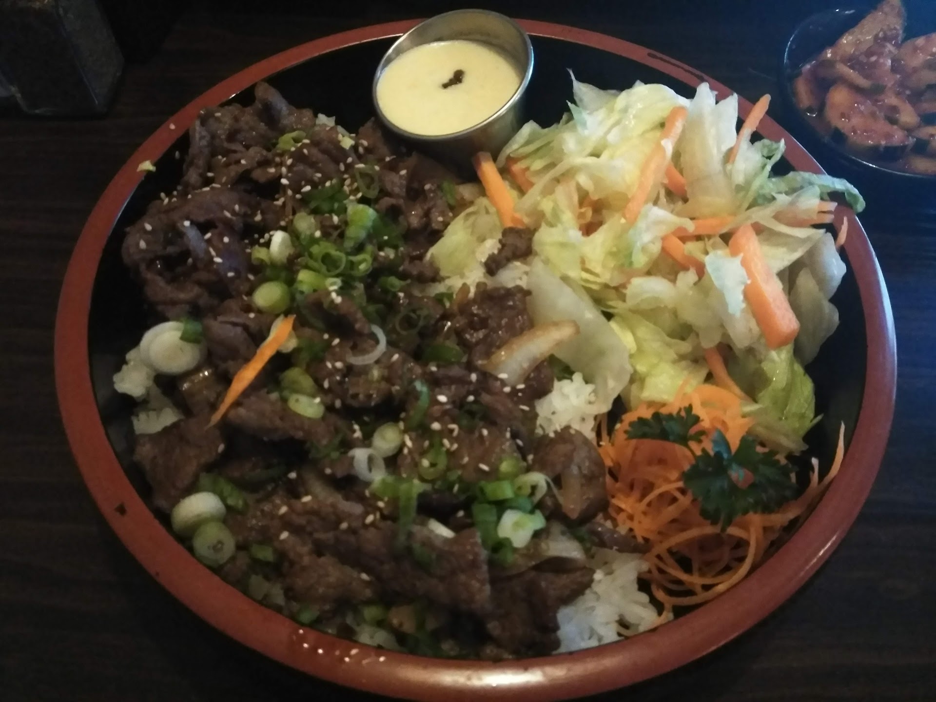 The Rainbow roll, stating in the menu “four kinds of fresh fish on top” had salmon, Avacado, and shrimp and tuna, which by my count is only two kinds of fresh fish. Kudos to the sushi chef for his ability in slicing the salmon to a paper thin, transparent slice as well.
