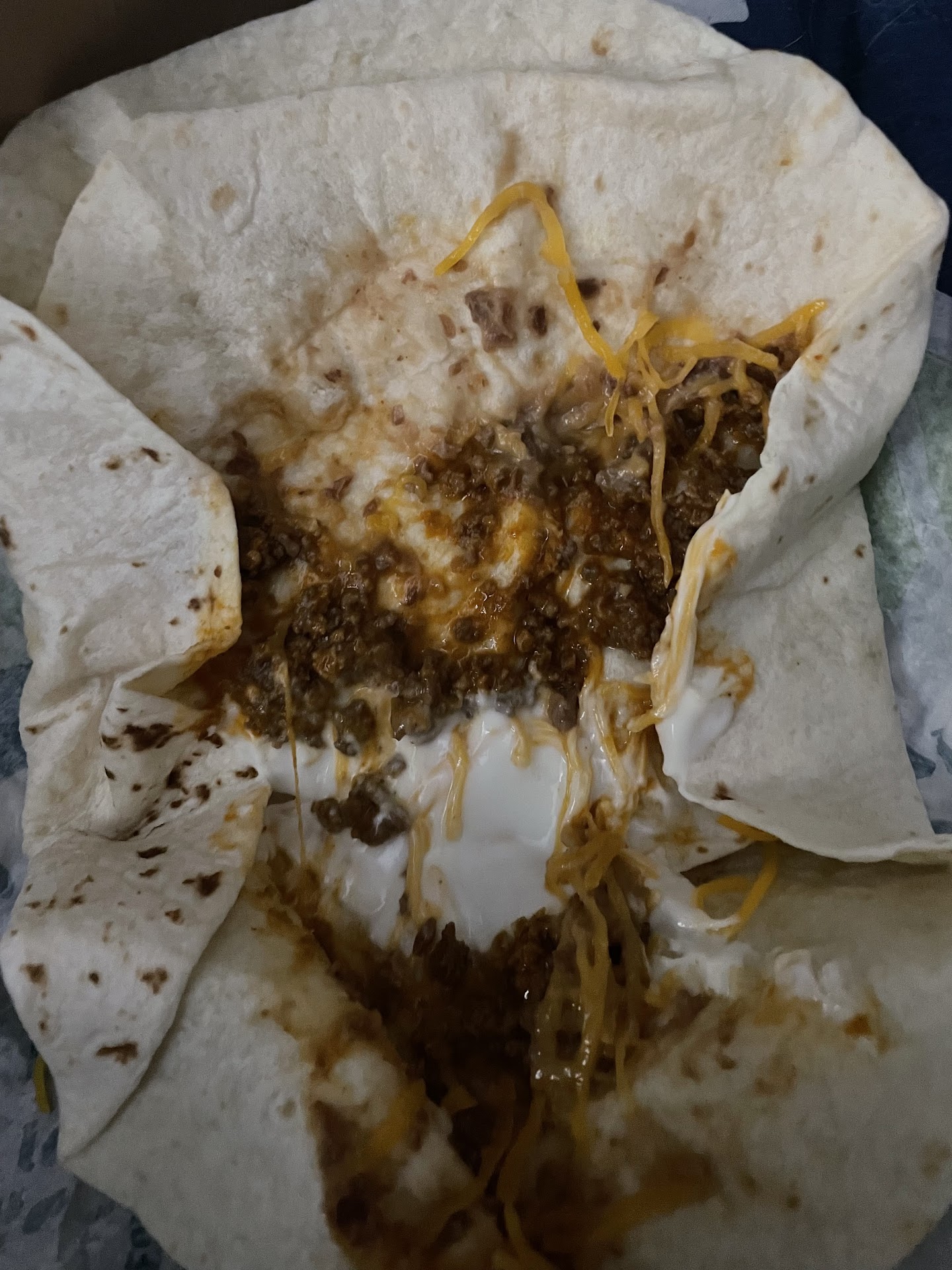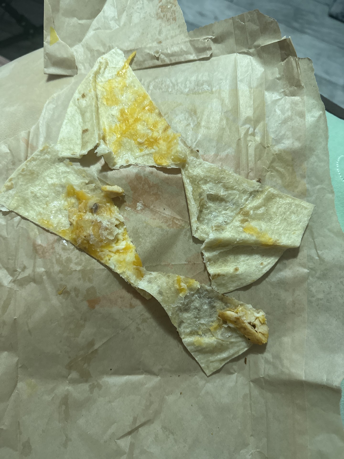 Read moreMy original review 2 years ago was that I don't go to any other Taco Bell location because this location rarely messes up my order. The employees are friendly and overall, I enjoy this establishment. However, I’ve tried reaching out to Taco Bell on this issue several months ago and multiple times, but they have no resolved the issue. The issue is that I often order chicken quesadillas, and I never get a good one. It’s always practically empty with barely any chicken or cheese. The sauce is nonexistent sometimes. And it’s never properly cut. Sometimes it not cut at all. Today, it was also burned which happens too. I just want a well made quesadilla. The photo I am posting is a picture of the contents of half a quesadilla. Keep in mind that these are almost $5.19 each. They were made better when they were...