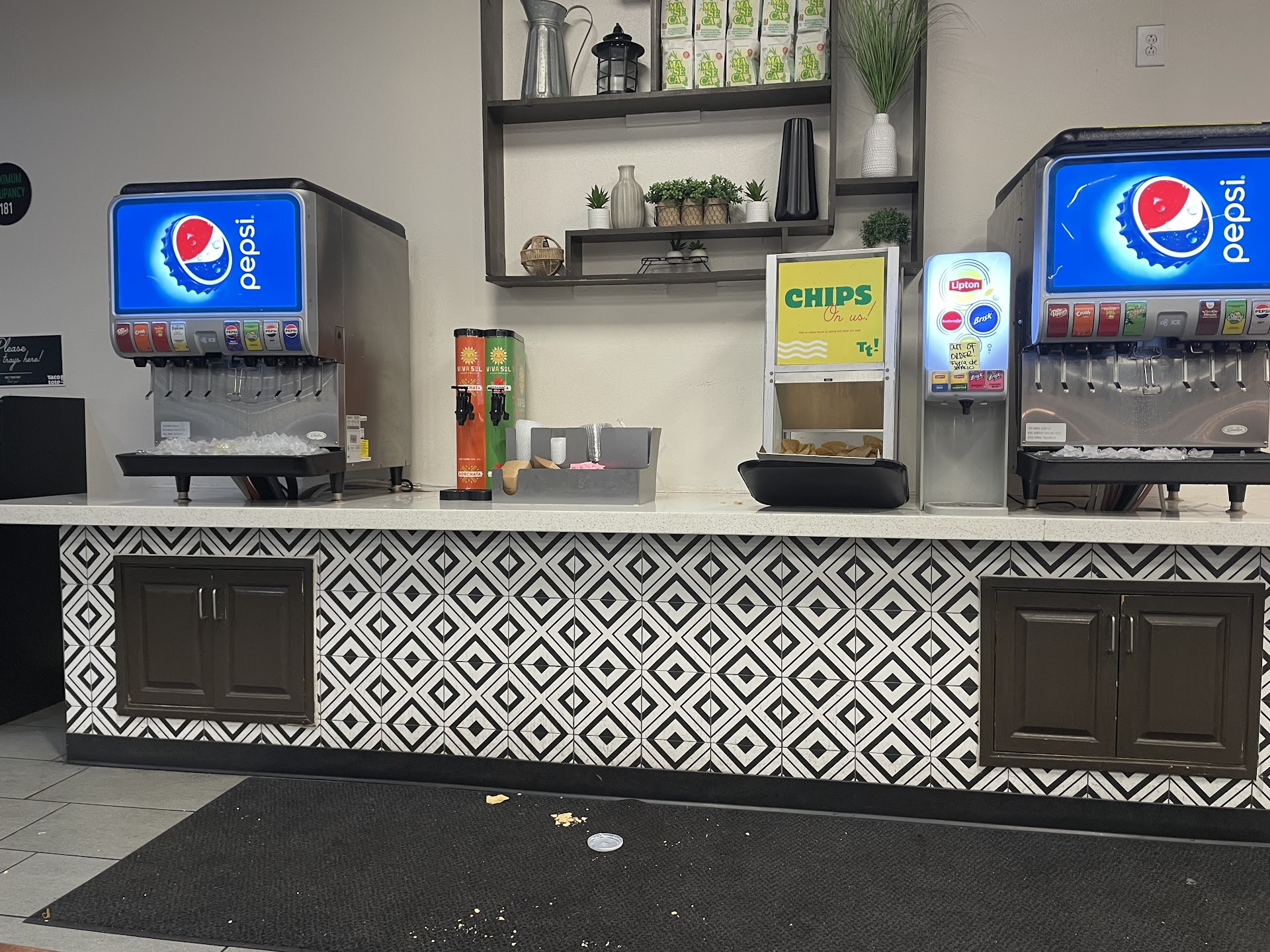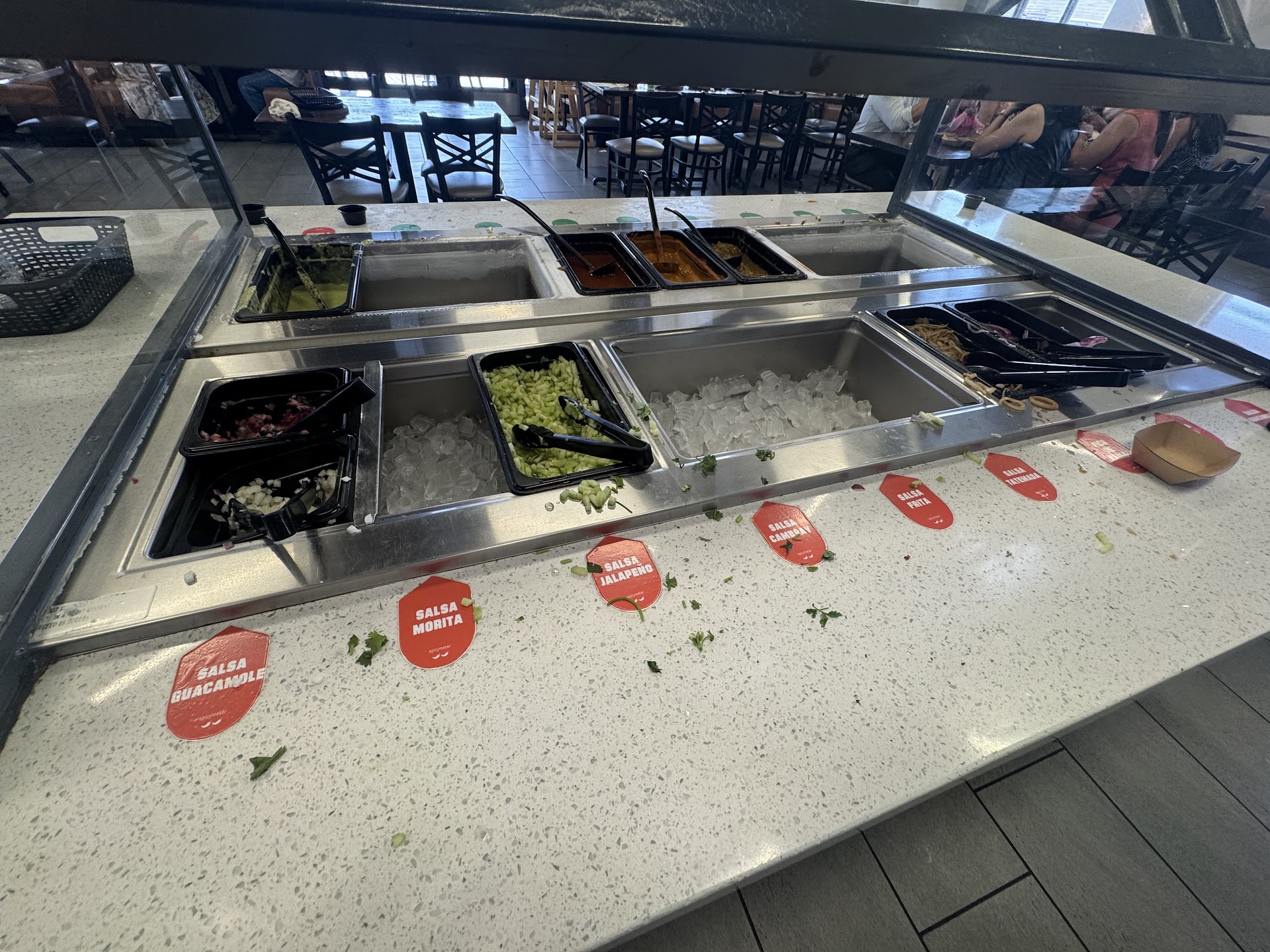Atmosphere? This is a bit tricky to rate and critique. It's an American fast-food restaurant that emulates a Mexican taqueria - which 99% of them aren't exactly Michelin Star restaurants. Given other restaurants such Taco Bell, Del Taco, and Taco John's, I'd say that this restaurant's style and decor holds up... Until you start paying attention to the people behind the counter. The people on the grill are hard at work 90% of the time, with the 10% being when they have the time to catch their breath. During that rest, you can tell that the pay that they're receiving ain't exactly worth getting worked to the bone for. I bring that up, because it's in plain view for the customer to see.