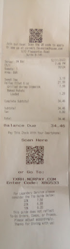 Read moreI ate at Texas Roadhouse at Freedom Crossing on New Year's Eve, Sunday, 31 December 2023. I got there at 1900 and they were scheduled to close at 2000. I was by myself, so they asked me to sit at the bar. I ordered my the 6 ounce medium filet and grilled shrimp with a loaded baked potato and house side salad with honey mustard dressing and a sweet tea to drink. I received my sweet tea and rolls, then shortly after my salad. Everything was going great until my main dish arrived. I received my fillet and grilled shrimp and was told my baked potato was still cooking. I ate my fillet and shrimp and finished my sweet tea. I then received my check. I asked about my baked potato that I was told was still cooking. My server went to check on it and had to order another one. My fillet was more medium rare than medium, but I didn't send it back since I could eat it and they were 30 minutes until closing. The baked potato was rushed since it was 15 minutes to closing. The inside was hot, but still kind of hard on the inside, but I ate it without complaining. I reviewed my check and saw that I was charged $21.99 for my fillet and $7.99 for the grilled shrimp instead of $27.49 for the combination meal. It was closing at this point so I paid it and left a sub-par tip sub-par experience. I'll chalk it up to New Year's Eve, going around an hour of closing, sitting at the bar or maybe my server was fairly new. Either way, I won't go to any restaurant during that timeframe again. My previous experiences have been great at this restaurant, so this was probably the "perfect storm" of events to lead to my...