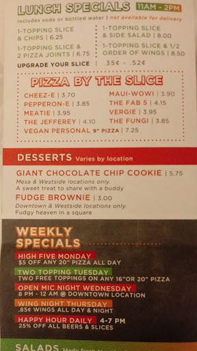 Im staying at the Holiday Inn and walked here for lunch. After reading the reviews I'm a little confused. I saw several bad reviews about the service... I assure you that the persons responsible for the bad service previously have been dealt with.. I walked in and right away I was greeted by a BIG guy in a cool hat. HE STOPPED WHAT HE WAS DOING AND GREATED ME WITH A SMILE! Now I have never been here before so I had no idea what to order. Without hesitation the guy asked what kind of appetite I had.. He explained that I could either order a whole pie, or "by the slice" He pointed to some examples close by and started telling me what was popular. After some talking I chose 3 different types of pizza. "The Jefferey" is like a supreme. The "Fab 5" has tomato and peppers and other awesomeness on it. The "Meatie" is like a meat lovers but way better. I got the receipt and was told they would have it right out. Sure enough a short bit later my meal was ready. Now Folks... These guys carried it out to me like a police escort! The only thing missing were the lights and siren. Each pizza was really fresh and hot! I have to say this was a great meal. It was fast, tasty, and fresh! Just when I tought it couldnt be any better, I was looking around during my meal. The whole place was very clean and there is art on the wall to spark conversation and debate over. Lol. Overall this place is great. I do highly recommend that you try it. Talk to the big guy and tell him I sent you. They will treat you like a Pal they haven't seen in a good while. As an added bonus, my bill did not...