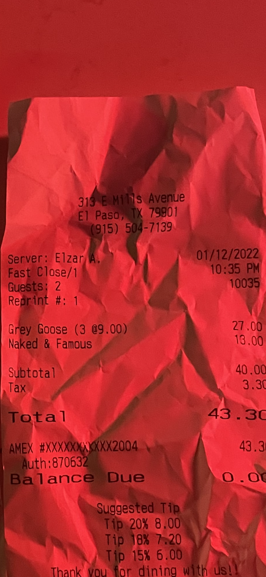 Read moreI recently stumbled upon a hidden gem in downtown El Paso, and let me tell you, it's unlike any cocktail bar I've ever been to. The atmosphere is fantastic – a true hidden gem. But the real stars of the show are the cocktails! My bartender, Riley, was incredible. She crafted some of the most interesting and delicious cocktails I've ever had. Not only did they taste fantastic, but she even shared a bit of the history behind them and how they were made. For those with a sweet tooth and a whiskey kick, I highly recommend the "Palomita Negra." If you're looking for a smoky and spicy adventure, the "Al Pastor Margarita" with its mezcal infused with peppers is a must-try! It packs a punch of unexpected heat. While I only stopped in for drinks, the food menu looked absolutely delicious, with dishes designed to complement their creative cocktails. Apparently, Thursdays turn into a blast from the past with karaoke nights! Picture a room full of people belting out Johnny Cash classics and a few other classic old school singers here Willie Nelson, Waylon Jennings, Dolly Parton. It looked like a ton of fun for anyone who enjoys a good sing along. And here's the kicker – they have a whole separate mezcal bar on the second floor! If you're a mezcal fan, you don't want to miss this hidden gem within a hidden gem. Overall, this place is a total winner. Fantastic drinks, knowledgeable staff, a fun atmosphere, and potentially delicious food – what more could you ask for? I can't wait to go back and explore more of their cocktail menu since...