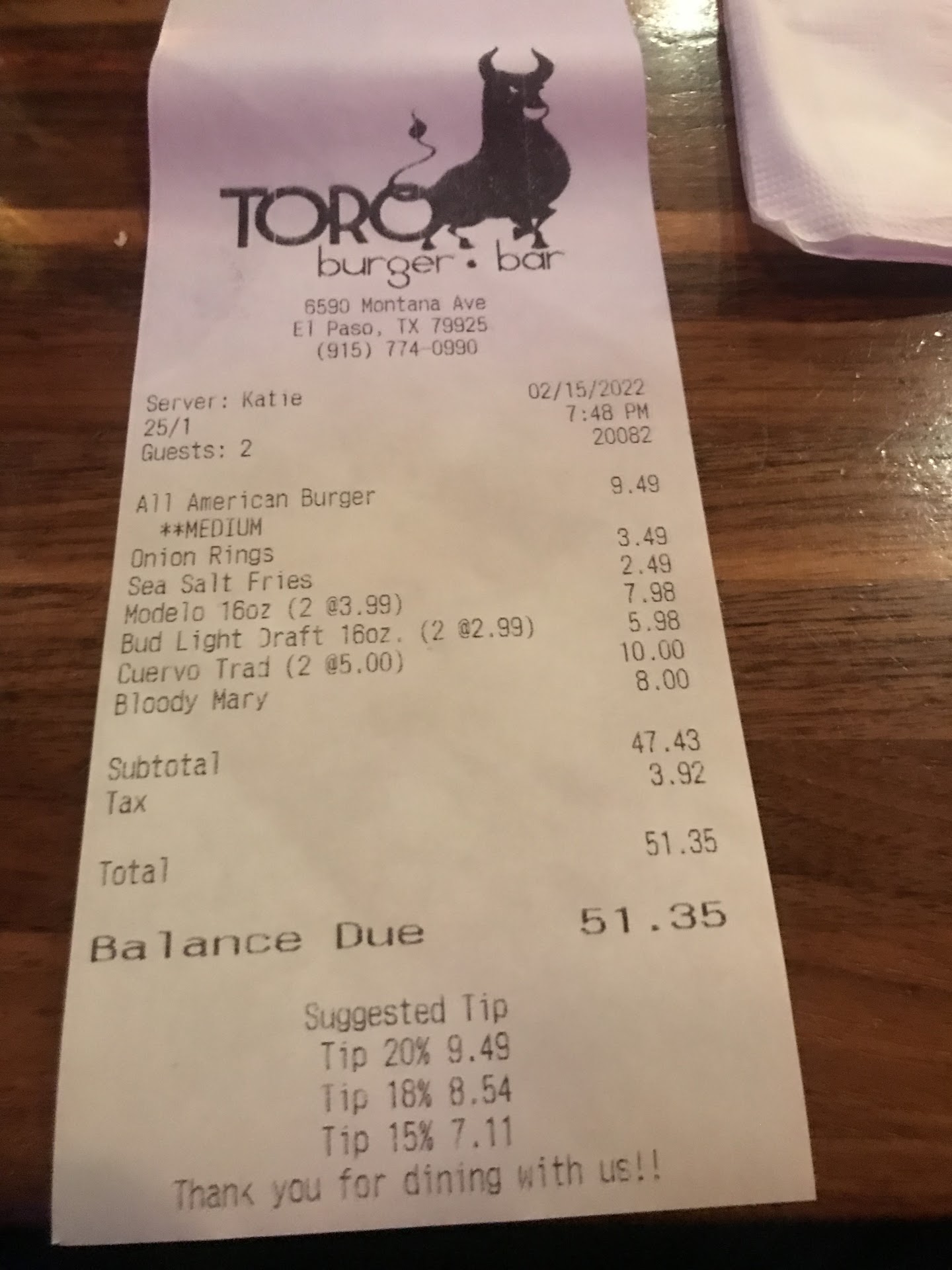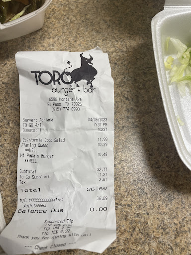 Read moreToro Burger used to be fantastic but the quality and service has slipped in a big way. My wife and I ordered burgers and fries and our granddaughter ordered boneless wings and fries. The waitress also took mine and my wife's drink order and started to walk off without taking our granddaughter's drink order. We stopped her and squeezed her drink order in. Bear in mind they weren't busy, three other tables besides us and plenty of servers on shift.