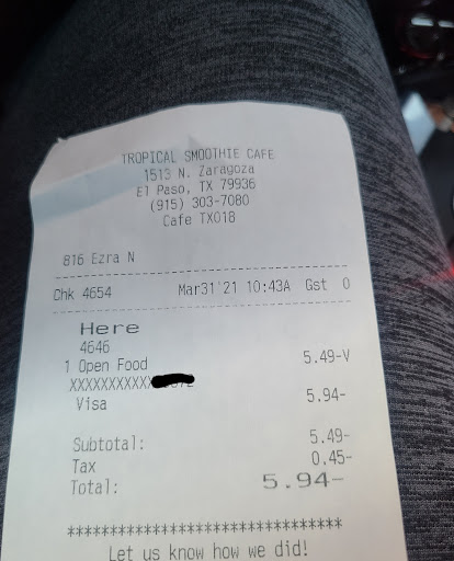 Read moreI’ve been to TSC several times and my experience has usually been pretty okay, nothing special but nothing noteworthy enough to complain about. On Sunday 10/17, I went in and ordered a Strawberry Chia Lemonade smoothie (which I’ve had twice before, from this location and from the other El Paso location). For starters, only one (1) of about seven employees was wearing their mask. The rest of the employees were not only maskless but engaging in PDA, flipping each other off, and swearing up a storm. The employee that handed me my drink seemed very upset to be serving me and said “have a nice day” in an annoyed mumble as she walked away from me.