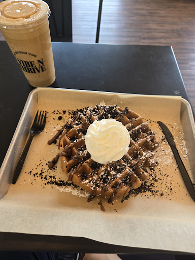 Love this place! As I was visiting El Paso, I took a walk from the airport to this lovely cafe. The walk was excruciatingly HOT but worth it once I tasted the dragonfruit refresher and funky monkey waffle! 100000/10, I highly recommend you try it. The waffle had a fluffy, moist texture and was sweet but not overloaded with sugar which I LOVED! The service was excellent! The ambiance was welcoming and comfy. I love a cafe with a nice book nook; it also had games there. Before I left, I got the vanilla matcha latte to go and it was hands down the BEST matcha latte I’ve had in months. Not saying I’m a matcha expert, but I go on match hunts in Houston weekly and haven’t tasted anything as amazing as the one I had here!! Thanks to the Vibe N Thrive family for making this trip enjoyable...