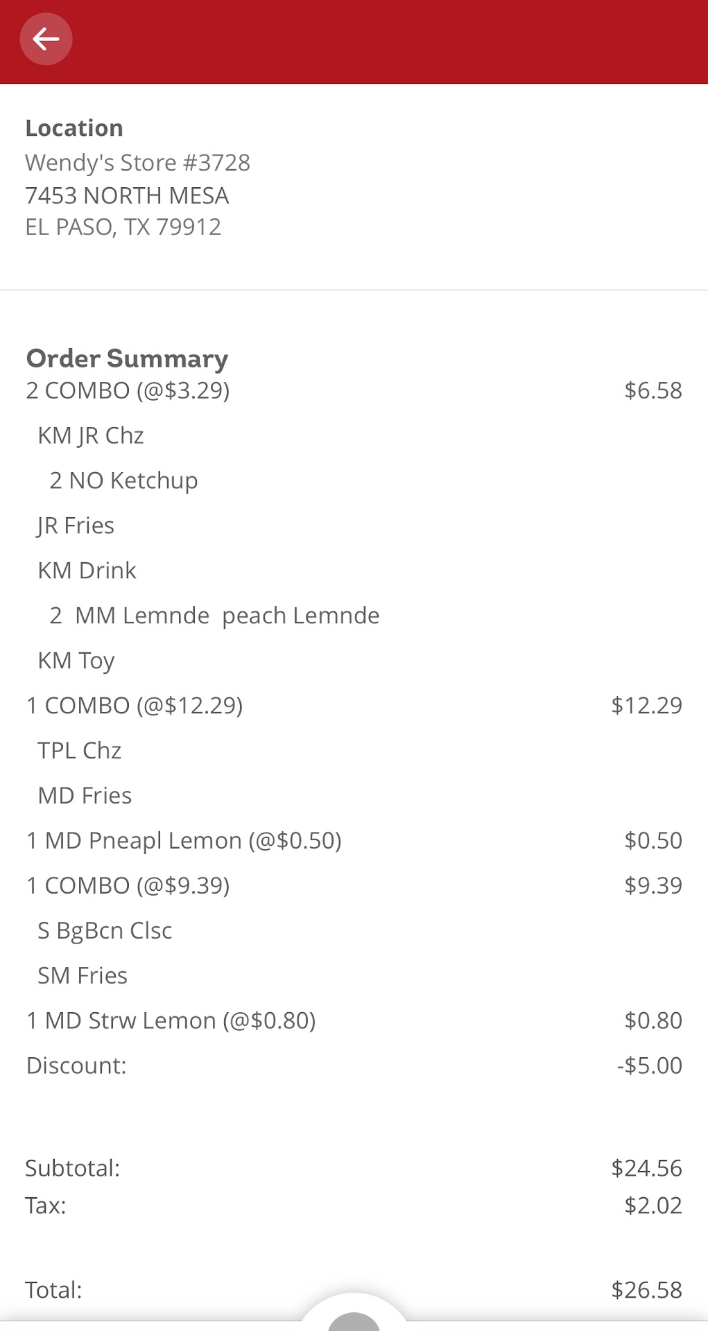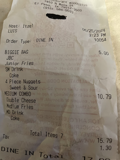 Read moreI am writing to express my dissatisfaction with the service at the Wendy's on 7453 N Mesa St. My experience at 8:51pm was disappointing and below expected standards. I was not offered my receipt and had to ask two employees for it. The first, who I believe was Sebastian, ignored my request and abruptly closed the window. The second employee, a tall woman with blondish hair, similarly failed to engage positively, initially closing the window before finally rudely informing me “they put it in your bag.” My order included a four-piece spicy honey barbecue nugget meal with ranch dressing, which was noted on my receipt but not included. This required me to return to the drive-through, where the staff seemed irritated by my request. Additionally, my partner’s large lemonade came without a straw, while I received only one straw for my small lemonade and one Frosty. The lid on my Frosty was also improperly secured, resulting in a spill that stained my rug. This is not my first issue at this location, leading me to urge management to address these persistent service problems. I hope future visits reflect the quality expected...