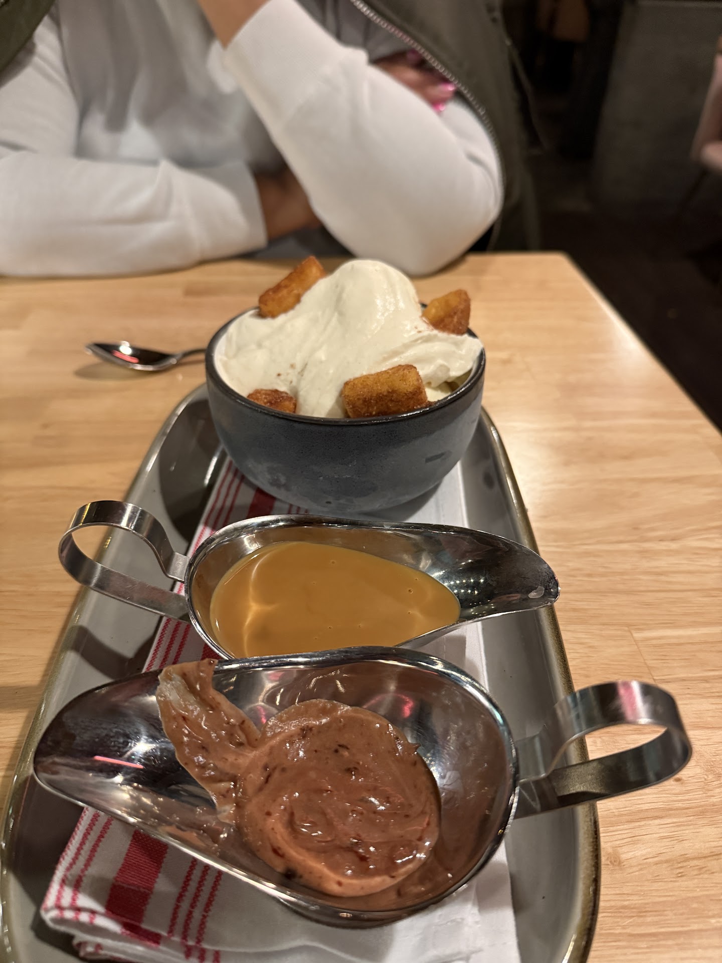 Let me start by saying the food was a solid 5/5—even though the rice and beans were lukewarm. My wife and I tried the filet mignon taco, shrimp taco, carnitas taco, and chicken taco, along with a side of esquites. For dessert, we shared the ice cream sundae topped with churro bites and caramel sauce. Super good (though let’s be honest, it’s hard to mess that one up).