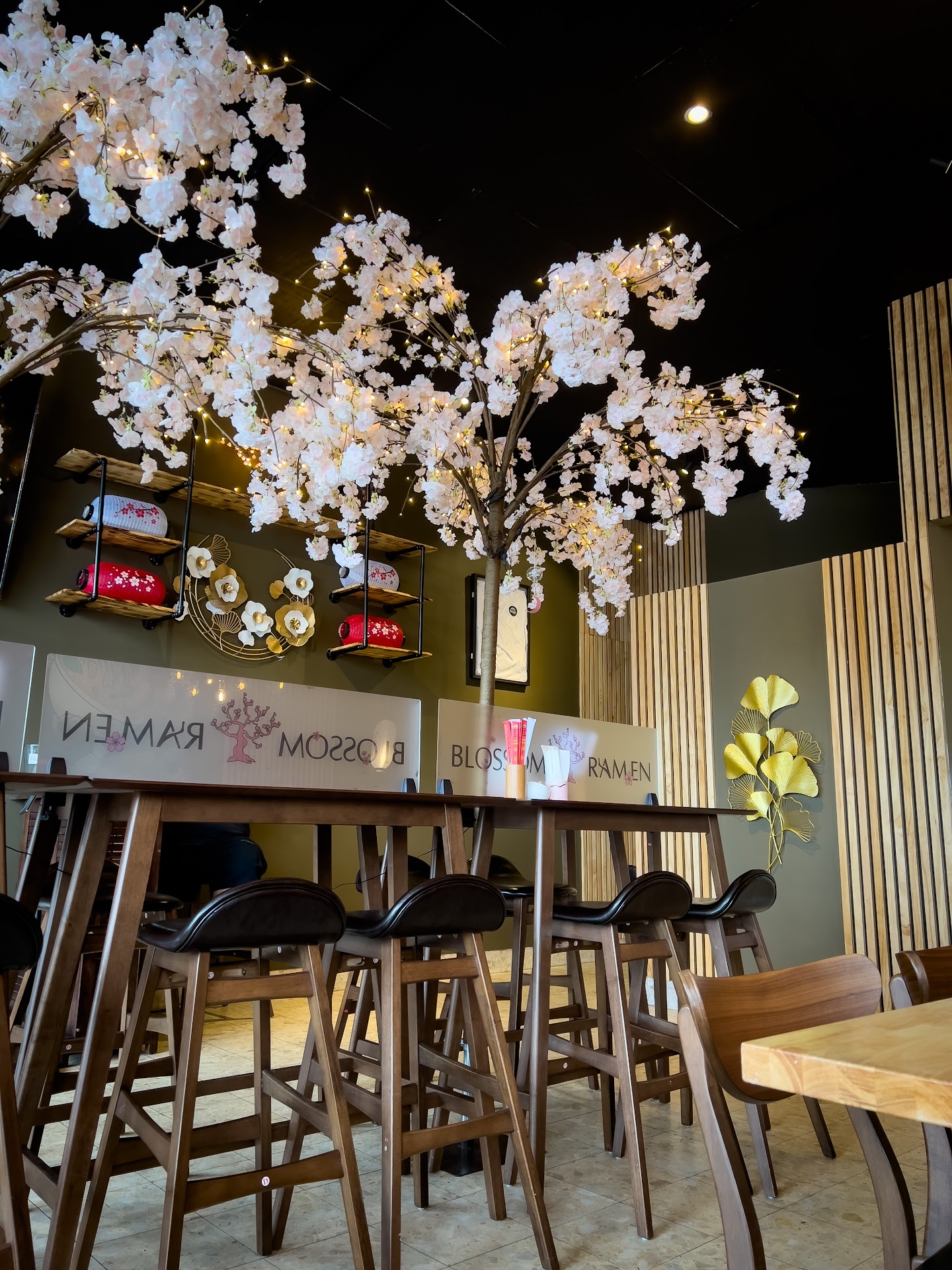 The interior of the restaurant is simply stunning, with a beautiful cherry blossom theme that adds a cheerful and calming atmosphere. You'll find plenty of seating options to choose from, including sit-down tables and high-top seats. Whether you're dining alone or with a group, there's a perfect spot waiting for you.