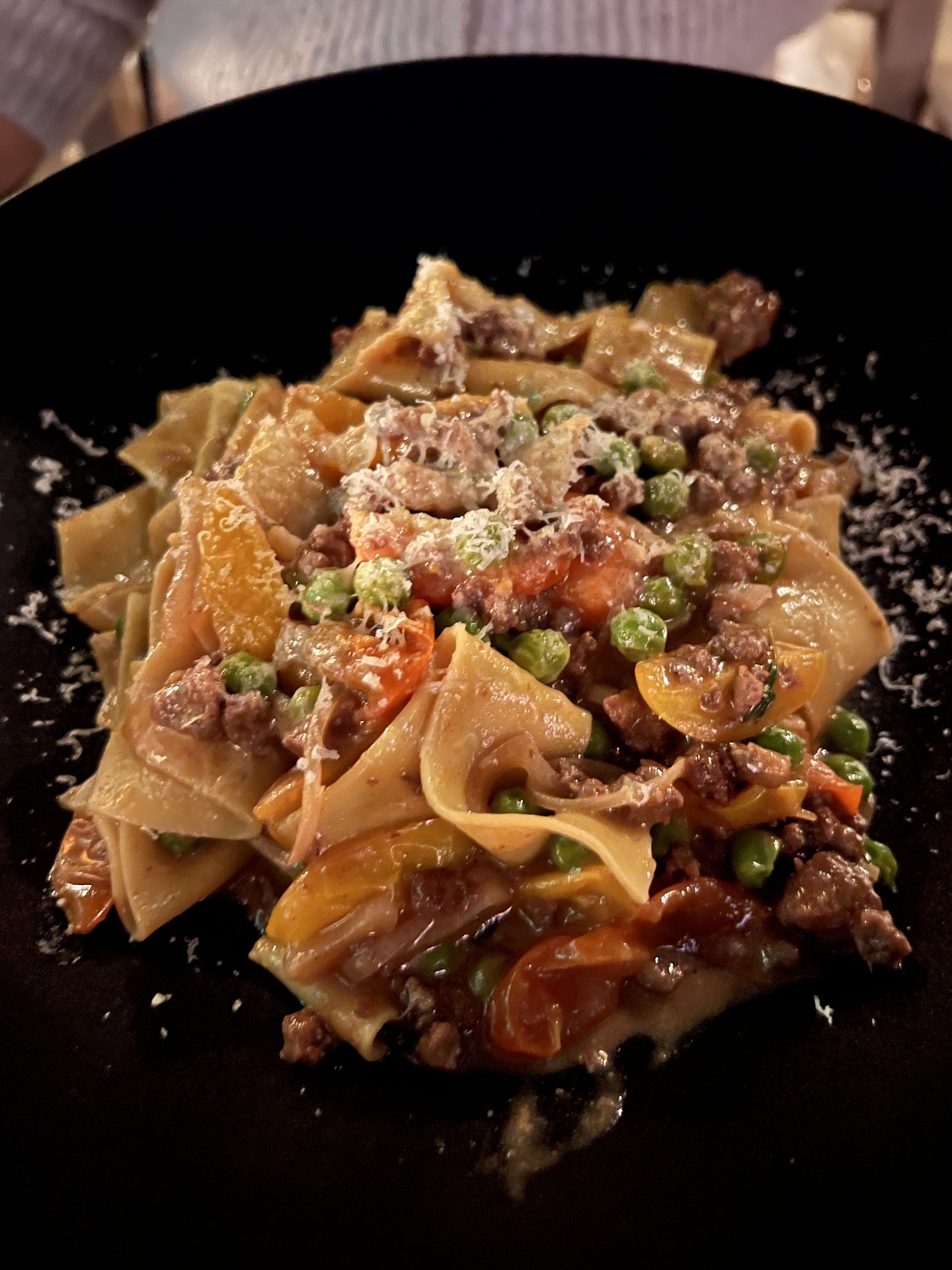 We started with a bowl of crab bisque -- excellent. We then had the wagyu beef bolognese -- this was good, but not spectacular. We found the papaparadelle slightly overcooked and we thought the English peas were unnecessary. The dish as a whole needed more of a zing as the flavor in general was rather monotonous.
