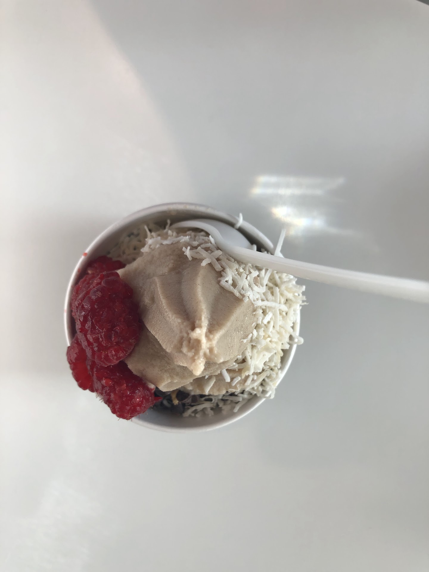 My order is always a large vanilla in a cup with strawberries, blueberries, sliced almonds, and the almond butter drizzle. The almond butter drizzle will actually change your life, let me inspire you.