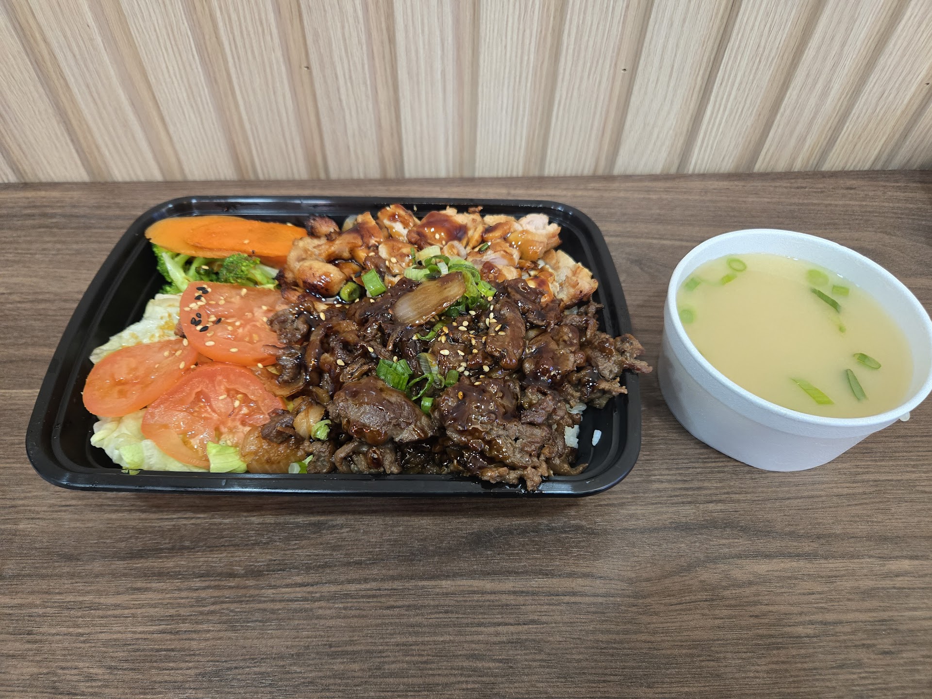 I ordered a chicken and beef plate and got a miss soup. The service took a little while as they heated my meal on the flattop. The miss soup was very homey and comforting on a cold day if a bit too much saltiness. When I received my food I noted that it wasn't scoarchingly hot as food off the grill would be expected to be. It was hot, but no wisps of steam greeting my nose. The rice is good, nice and sushi quality with an excellent mouth feel but the meat itself was lacking a bit. It wasn't extremely tender but it did have whatever savory flavor it was doused with on the grill. The vegetables are standard. Boring with a touch of vinegarette. I wasn't wowed by the experience, but there are certainly good aspects of my meal and I can't say anything actively made me want to...