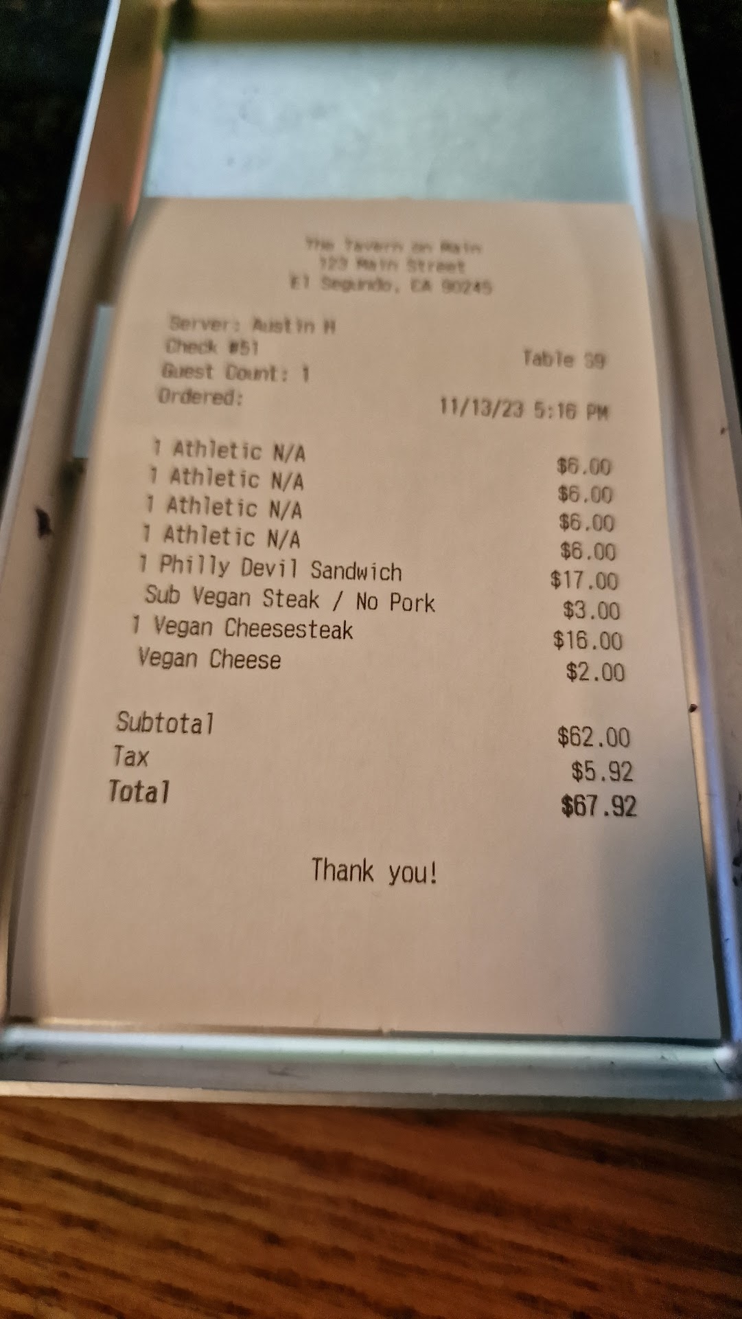When you get the check, I kinda thought 'okay' putting 2 things off the sandwhich, and adding 1 thing would at least equal the pricing. Not at The Tavern. Paid extra 3 USD for it. Also, for my buddy. Ordered a Vegan Cheesesteak. But for vegan cheese, you had to pay extra. Common. 😀
