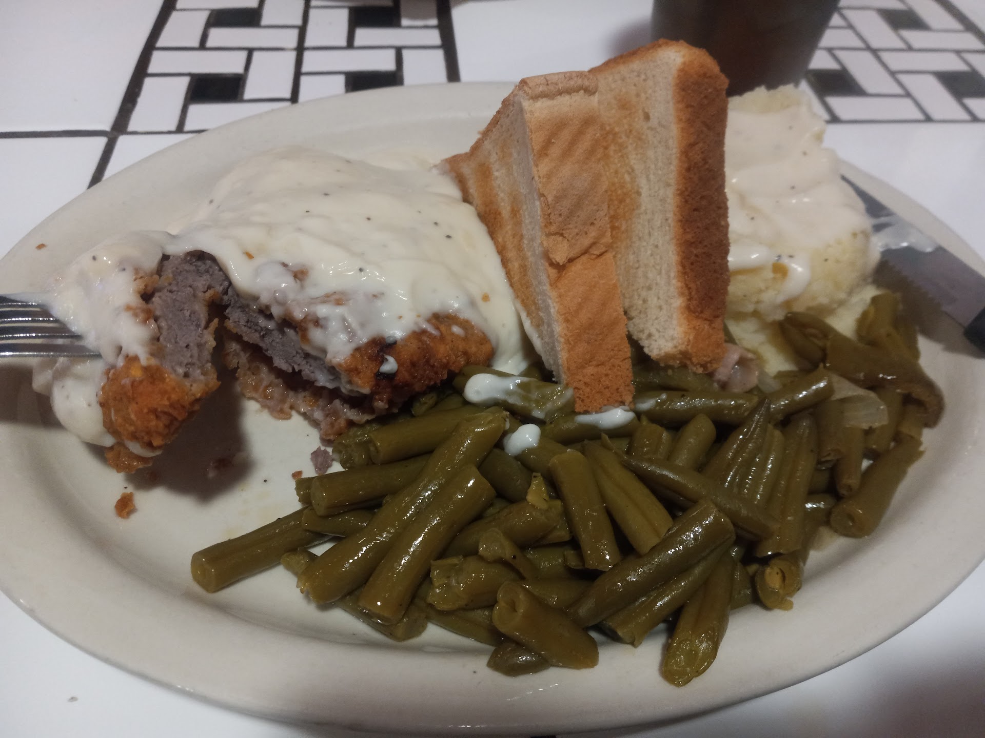 Well, it is one of two restaurants in town. Regardless, it's only fair to judge it on its own merit... Which isn't much. This restaurant understands there's no point in spending exorbitant amounts of cash on decorating well, or getting good comfortable chairs and tables, or in making a good menu with good ingredients. Is this one of those "gems in a small town"? - not really. But being the only other sit-down place to eat aside from the Carlito's down the street, you have to set your expectations right. I've been here 4 times and every meal I've had is either just average or slightly below. And the prices are not " we know we're not working with much so we'll adjust accordingly." Expect to pay just as high as you'd pay in a bigger town. The service is not that "Texas hospitality" super nice kind of service you'd expect, either. This diner offers no more than just the bare minimum - just food, and not very good...