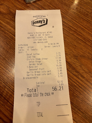 3rd and last visit, 2/3/2020 @ 1:15 PM: Avoid this place if you want a good place to eat. My wife arrived at this Denny's and we were walking in behind another couple with 2 small children in hand. As soon as we all walked in, the manager was standing right in front of us all, refused to look at any of us, and when he did, all he did was scowl and keep a frustrated look. No greetings, no good afternoon, nothing. With a partly empty restaurant, I would assume they would appreciate some fresh faces. But yet again, they disappoint. My wife and I turned around and left. This restaurant is literally about 2 miles from my home, but luckily IHOP is just as close and they managed to save my afternoon. Avoid at all costs and just head up north from here to the IHOP on 19. Friendly staff, fresh food with excellent quality. I wish I would have known about the IHOP sooner.