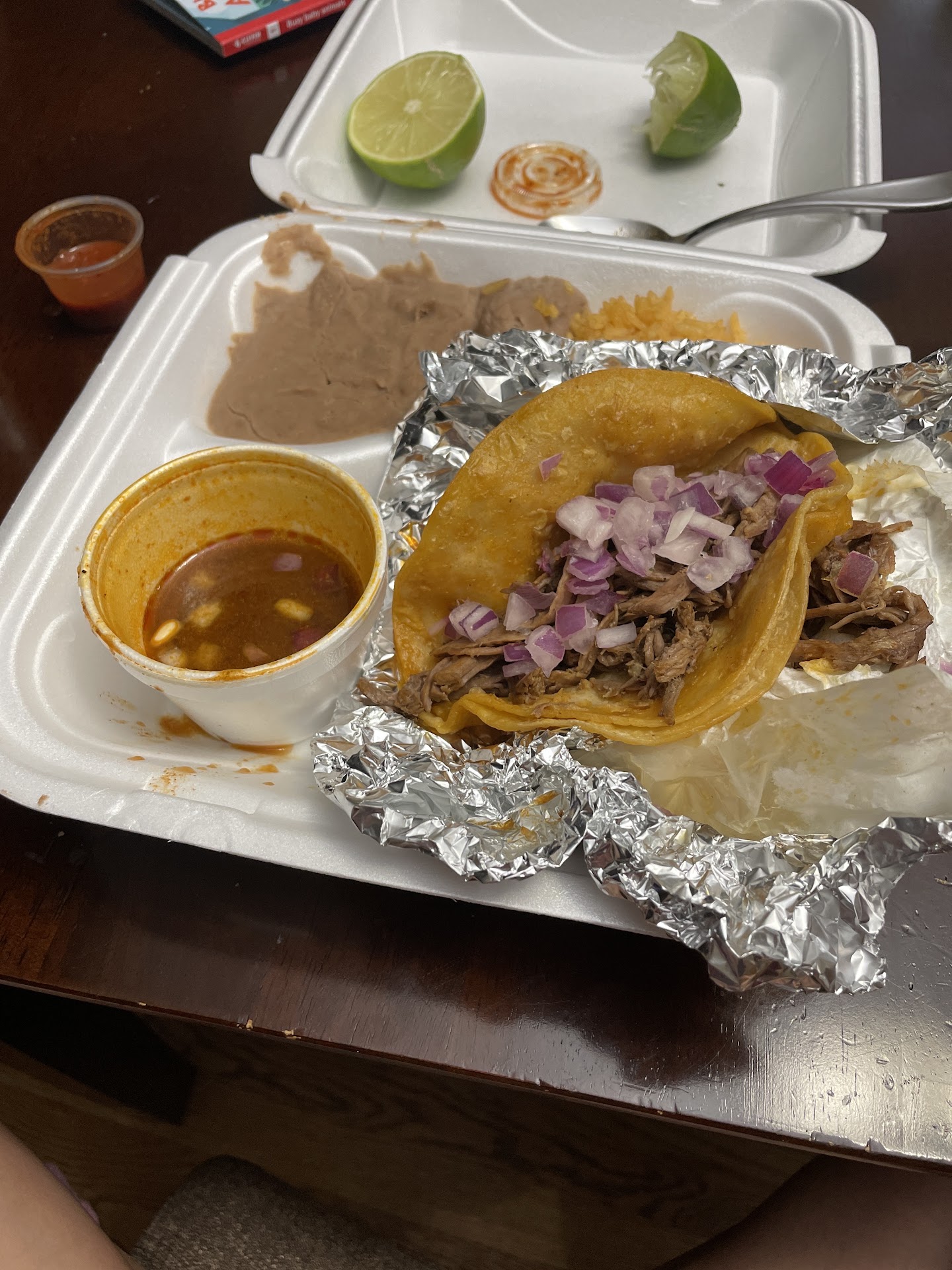 First I want to say I love tacos! With rice and beans and what you gave me for how much you charge is unbelievable. I ordered at 10:26pm came to pick it up at 10:35pm. I Thought since nobody is in there while walking in and how high you guys are rated online that my food should be PIPING HOT FRESH! Noooooooooo it was cold 🥶 had to come home and warm it up. THEN TO FIND OUT YOU GUYS PUT OLD WILTED ONIONS AND CILANTRO ON MY TACOS! WAS THE KILLER PART REALLY LOST MY APPETITE.