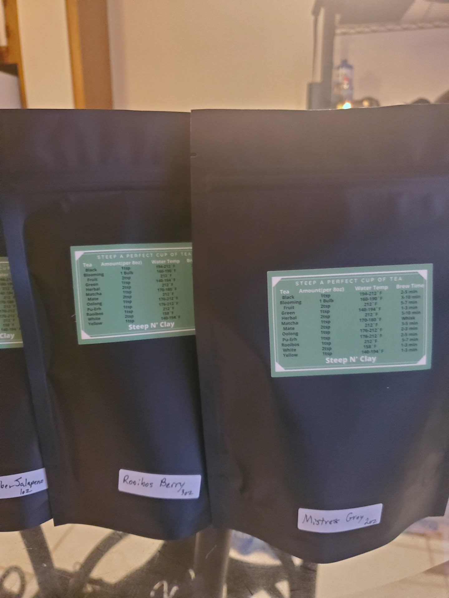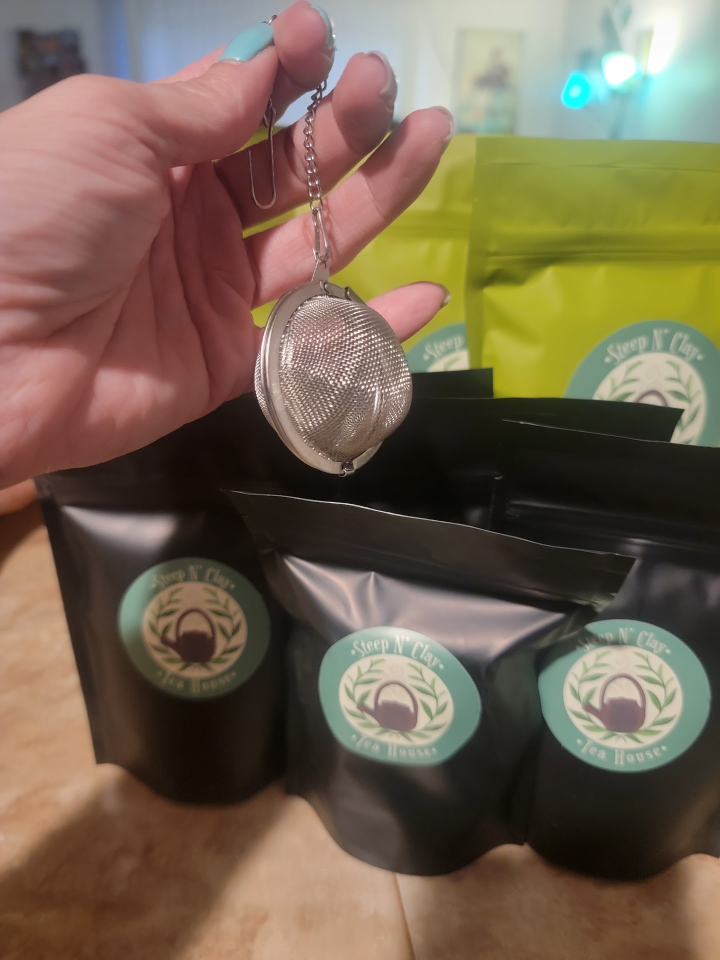 A week later, my wife wanted to know what else they had. Let's go for a visit. The smell of their shop is great, even for a non-aficionado. When my wife found out they have decaf Earl Gray tea, she was thrilled. She absolutely loves it, I think more than the custom tea I ordered. The only drawback is the infusers I ordered (not from Steep n Clay) have large holes, and much of the Earl Gray seeped through into the mug. She strained out the mug with our kitchen strainer and finished her drink.