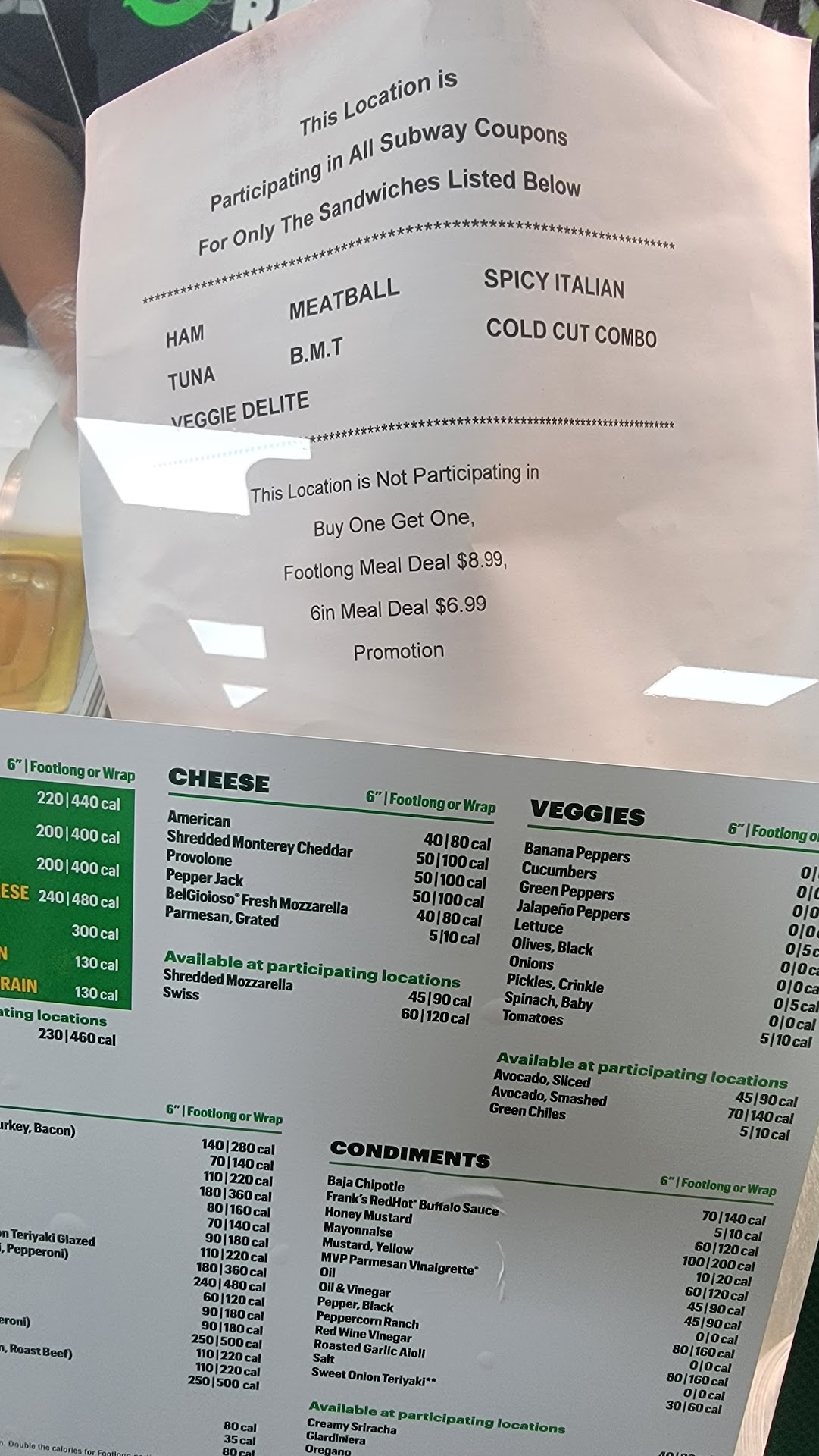 Read moreChanged their deal of the day to exclude footlongs and did not tell me untill they rung me up, even though I asked for the deal of the day on a footlong and they obviously acted like I was getting the deal. Then when I rung out I said I wanted to pay using their Subway app, they said oh okay! And had me push my phone to the kiosk to pay...but it used the credit card linked to my phone, not the app. I had deals associated with the app, which of course didn't get used. So my sub that would have been 6 50 then 2 dollars off with my coupon, was now 9 50, definetly not worth it. I'll stick to other competent...