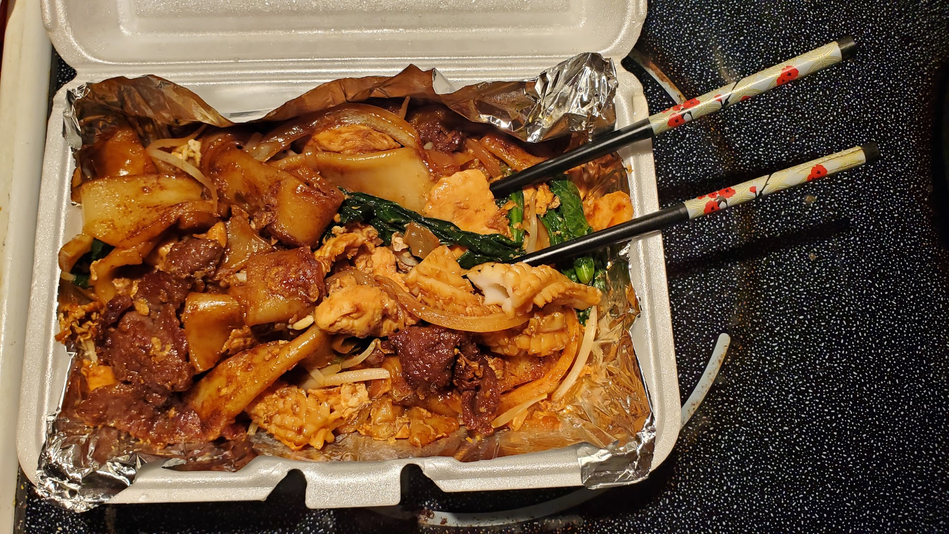 I have been wanting to try this place out for quite some time especially since it's only about 10 minutes from me. I ordered the combination Paad See Euw and Thai Iced Tea with milk. Both were good and the food had amazing flavor and the squid was tender which is hard to do, it can easily become rubbery if cooked to little or tough if cooked to long not to mention the large portion size. I ordered for pick up and the man at the counter was very friendly, I did accidentally walk off with their pen when I signed so if he sees this I'm sorry about that lol. Some of the other reviewers even by other local guides have almost all 5 star ratings to places they've been and I find it hard to trust those because to me 5 stars is exceptional not every place including a Taco Bell can be 5 stars (last name Ellen) but this place absolutely deserves the 5 stars that I rated it. I had to break out my nice chopsticks for...